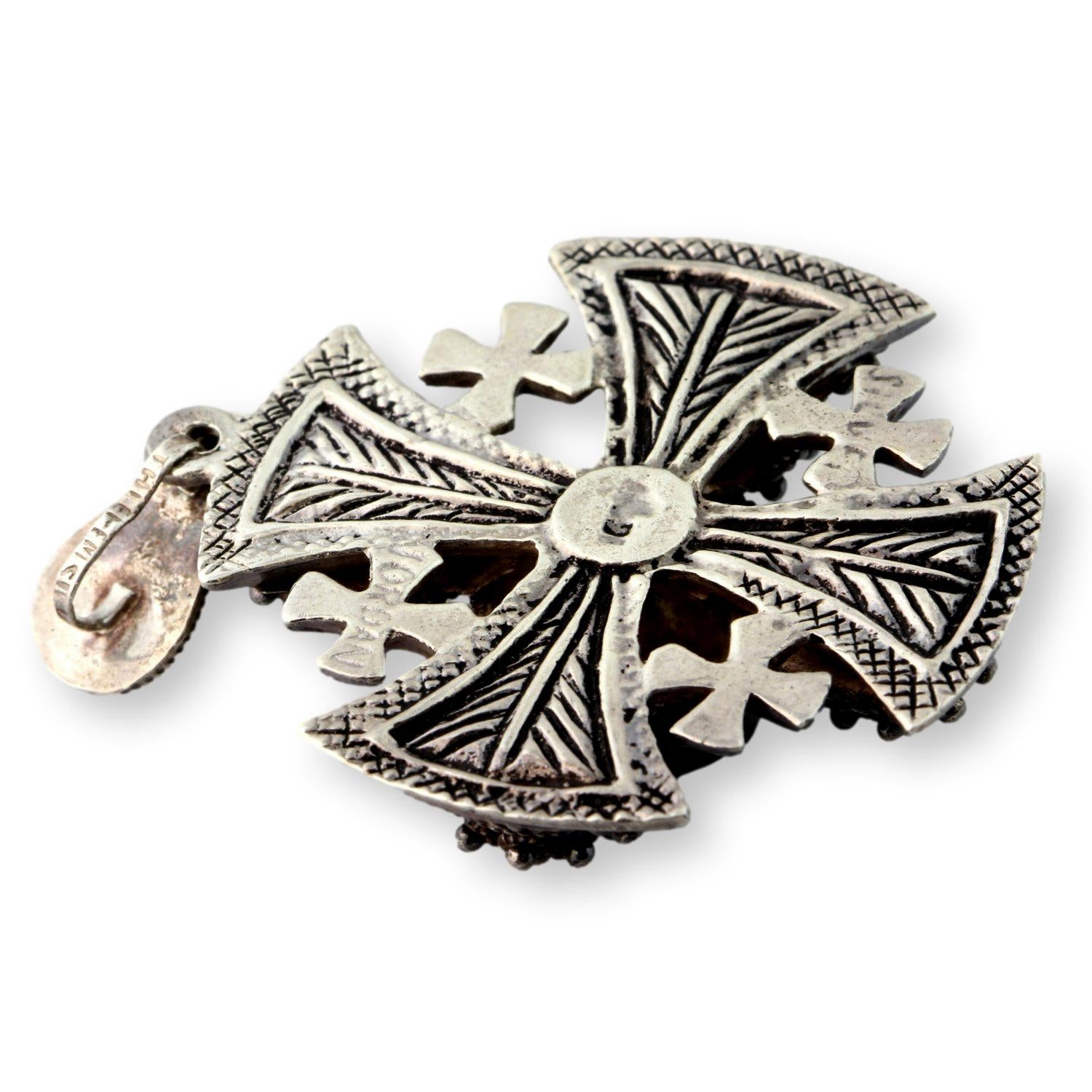 The front is richly decorated with intricate hand-applied filigree rosette panels forming the classic Jerusalem cross design, with four smaller crosses surrounding the central cross. This cross symbolizes Christianity spreading outward from Jerusalem to the four corners of the world, making it a meaningful piece of wearable faith and a collectible example of Bethlehem craftsmanship. The pendant and bail measure 2.5" in length and 1.75" in width. #90