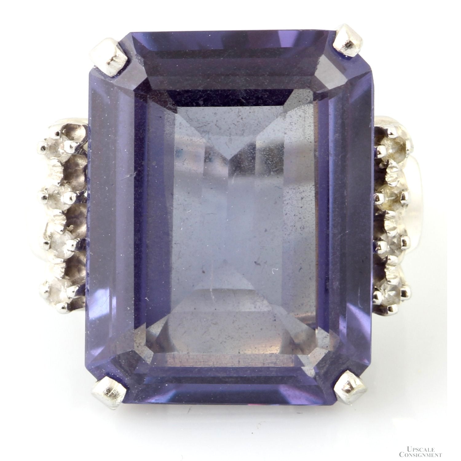This 10 karat white gold ring by Baden & Fox is center-set with one 15.00 x 20.00 x 7.16mm(d) emerald-cut lab-created purple sapphire that weighs 23.20 carats. Set to each side are four 1.5mm round brilliant-cut colorless sapphires. Collectively the eight colorless sapphires weigh .16 carats. The table of the purple sapphire has a few scratches that are barely visible to the naked eye.