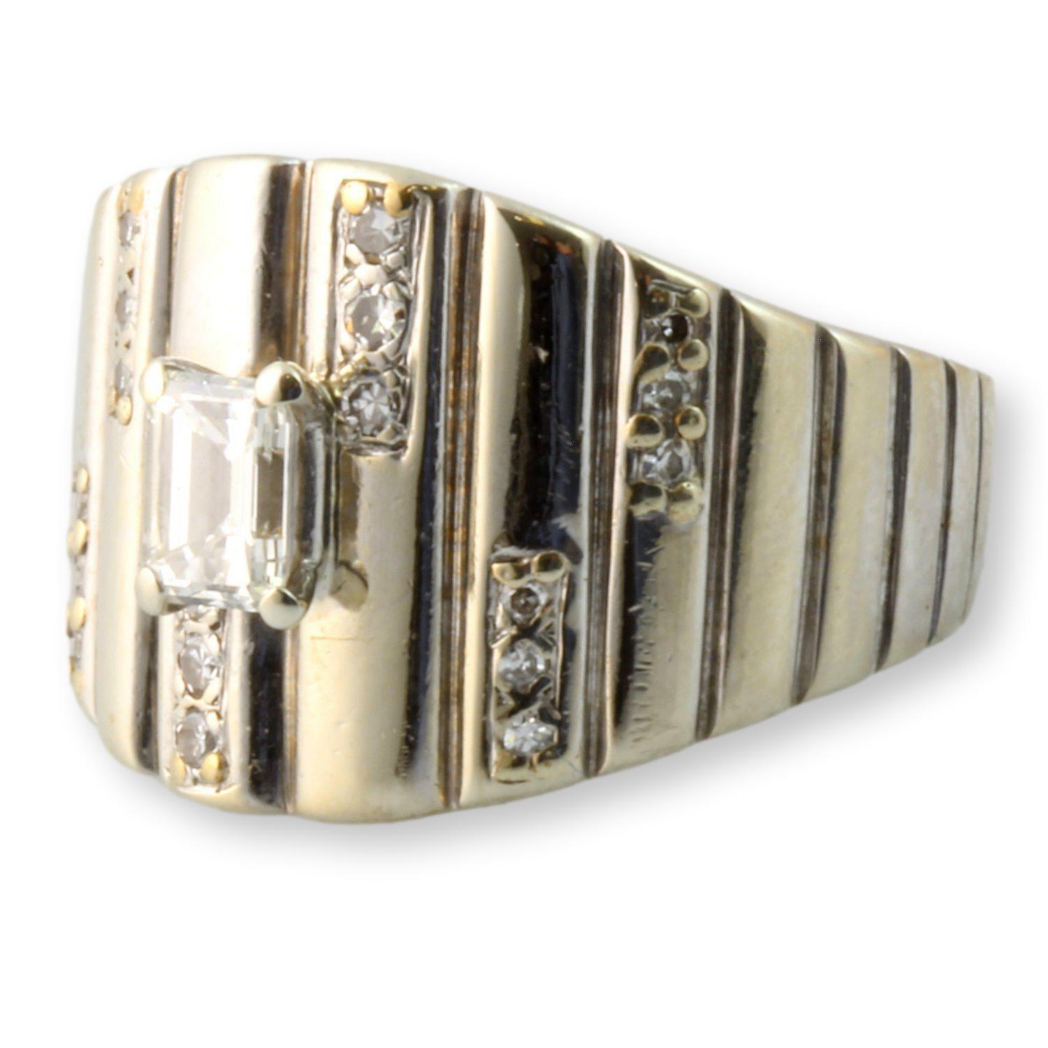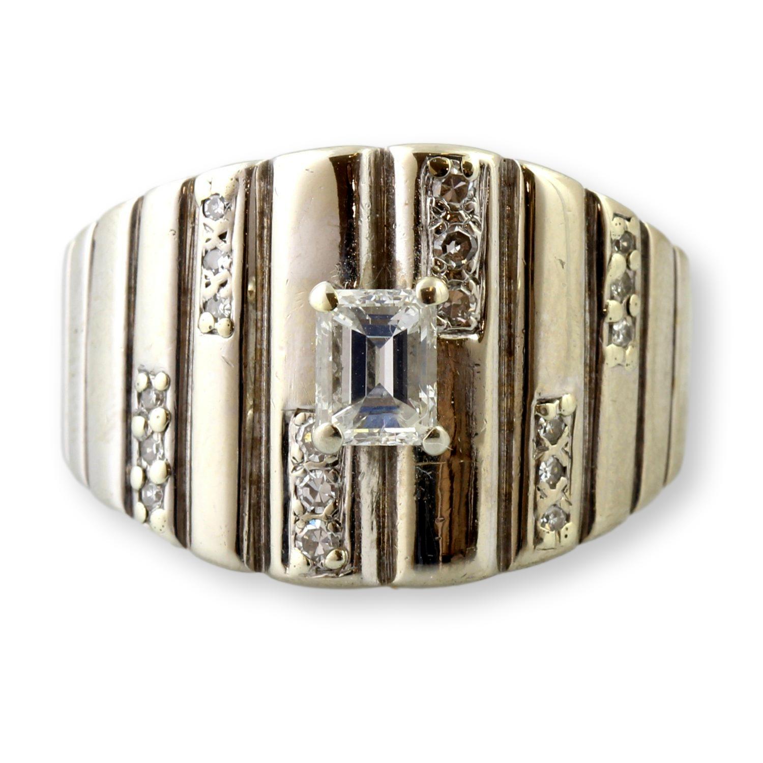 Bold geometric patterns, symmetrical arrangements, and high-gloss finishes evoke a mid-20th-century modernist to late retro style, characterized by unisex rings with ridged patterns and diamond accents that were in fashion. At its center rests an emerald-cut natural diamond weighing .87 carats, showcasing its clean lines and timeless elegance. Sparkling round single-cut accent diamonds, weighing 0.22ctw, are set in vertical arrangements along the band, adding shimmer and depth to the bold stepped pattern. The combination of sleek white gold and radiant diamonds creates a powerful statement piece - perfect for someone with refined taste who appreciates both strength and sophistication in their jewelry.