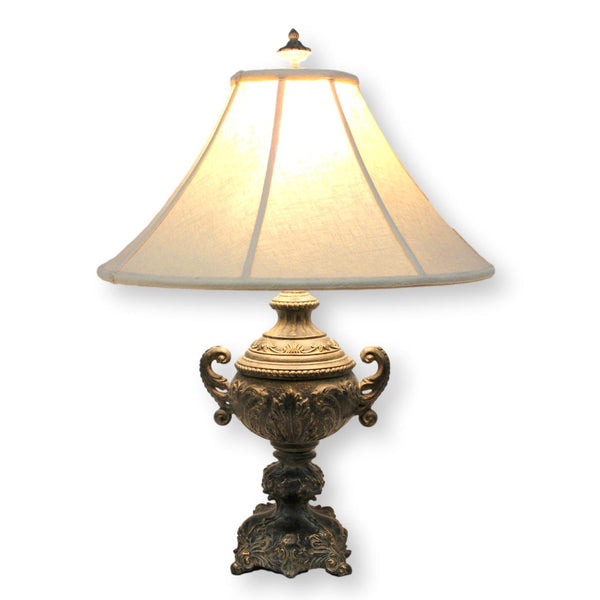 Ornately Carved Table Lamp w/Tan Oval Burlap Shade