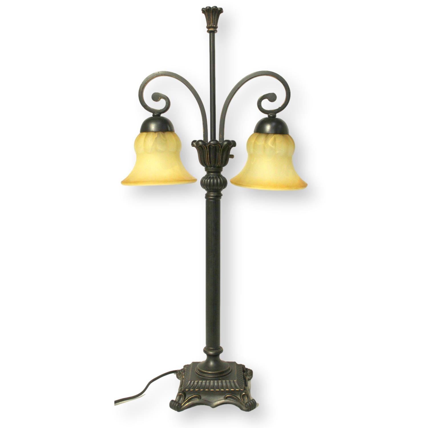 Vintage-style table lamp with a dark iron frame and ornate scrollwork detailing. Two curved arms support bell-shaped glass shades in frosted amber, each with a petal-like texture that diffuses warm light. The square base features carved accents and scrolled feet. Symmetrical design and aged finish evoke early 20th-century decorative lighting.