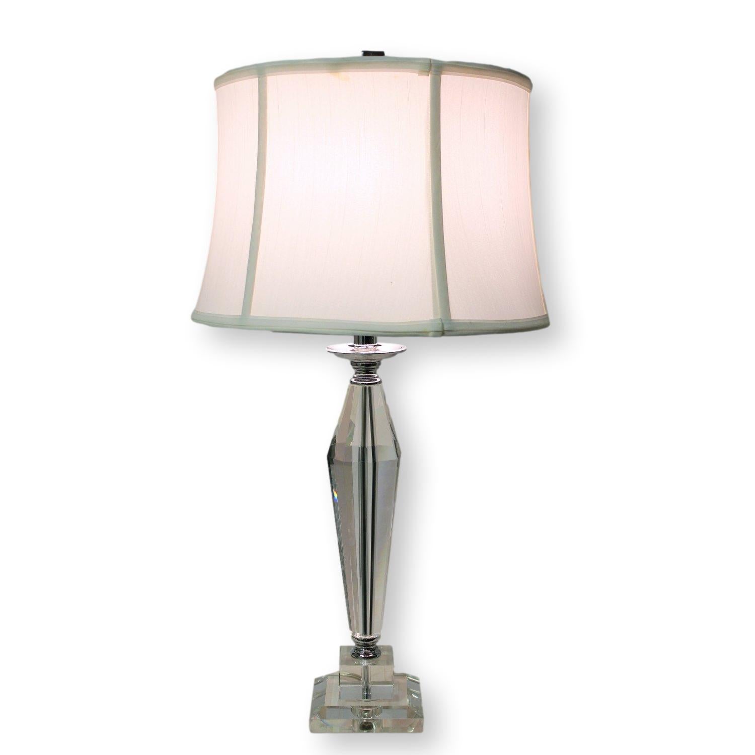 Faceted acrylic base tapers upward in a geometric silhouette, adding subtle dimension and clarity. The white fabric shade features vertical seams and a gently flared profile for soft diffusion. A polished metal connector anchors the shade to the base, balancing the materials with a clean transitional finish. Suitable for bedside, console, or accent lighting.