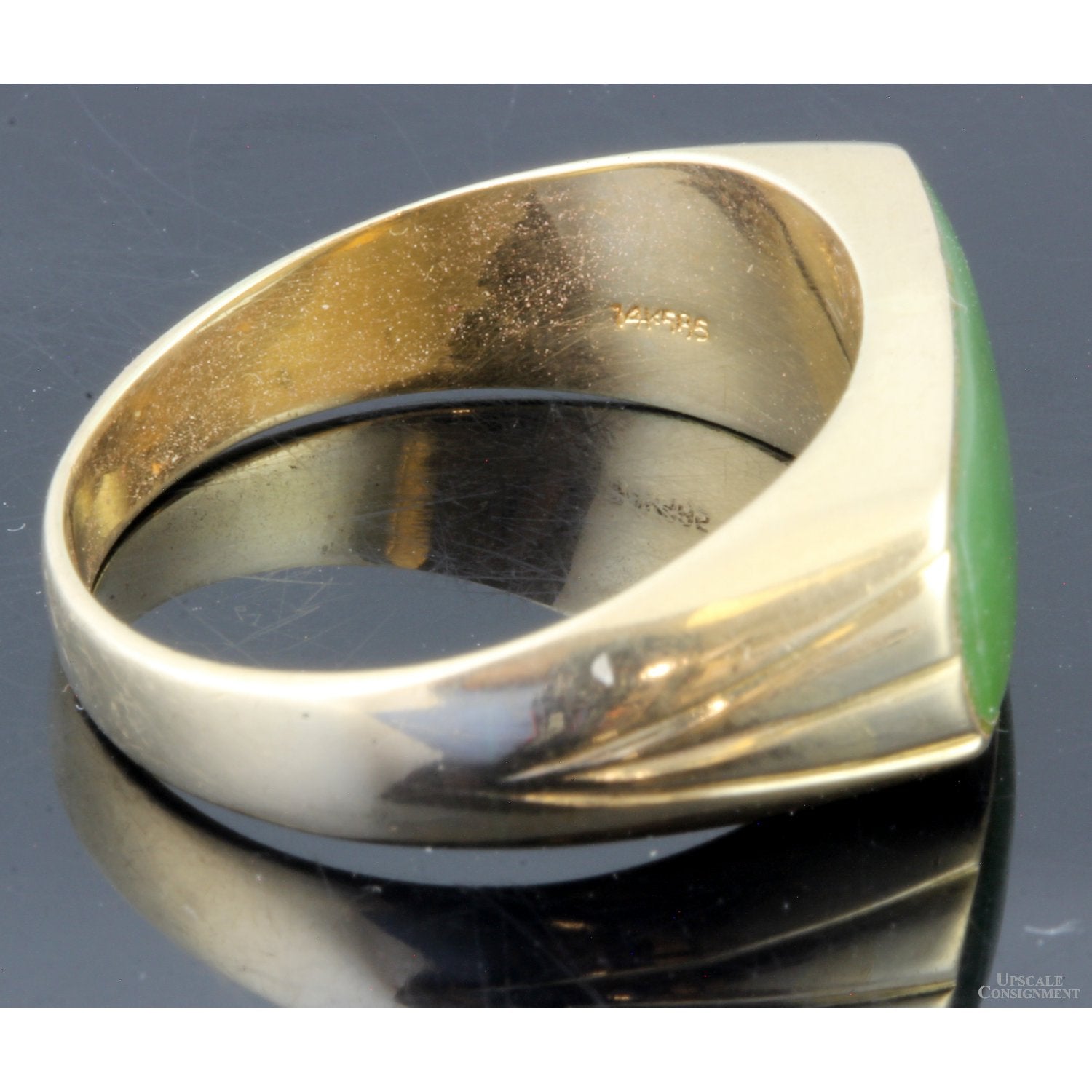 Jade saddle rings are timeless, having a history dating back to the early 20th century, giving them a vintage appeal that remains to this day. The elongated east-west orientation highlights the most colorful or most transparent part of a jade stone, positioning it on top of the ring. The substantial, seamless design of the saddle ring combines traditional craftsmanship with a unisex style that is a hallmark of jade jewelry, making it a distinctive, sought-after piece. The nephrite jade stone set in this ring measures 17.0mm x 7.5mm and weighs approximately 3.33 carats. The shoulders of the ring feature three carved channels on each side that radiate upward toward the jade. Typical of saddle rings, the ring's design is simple but elegant. #90#A.