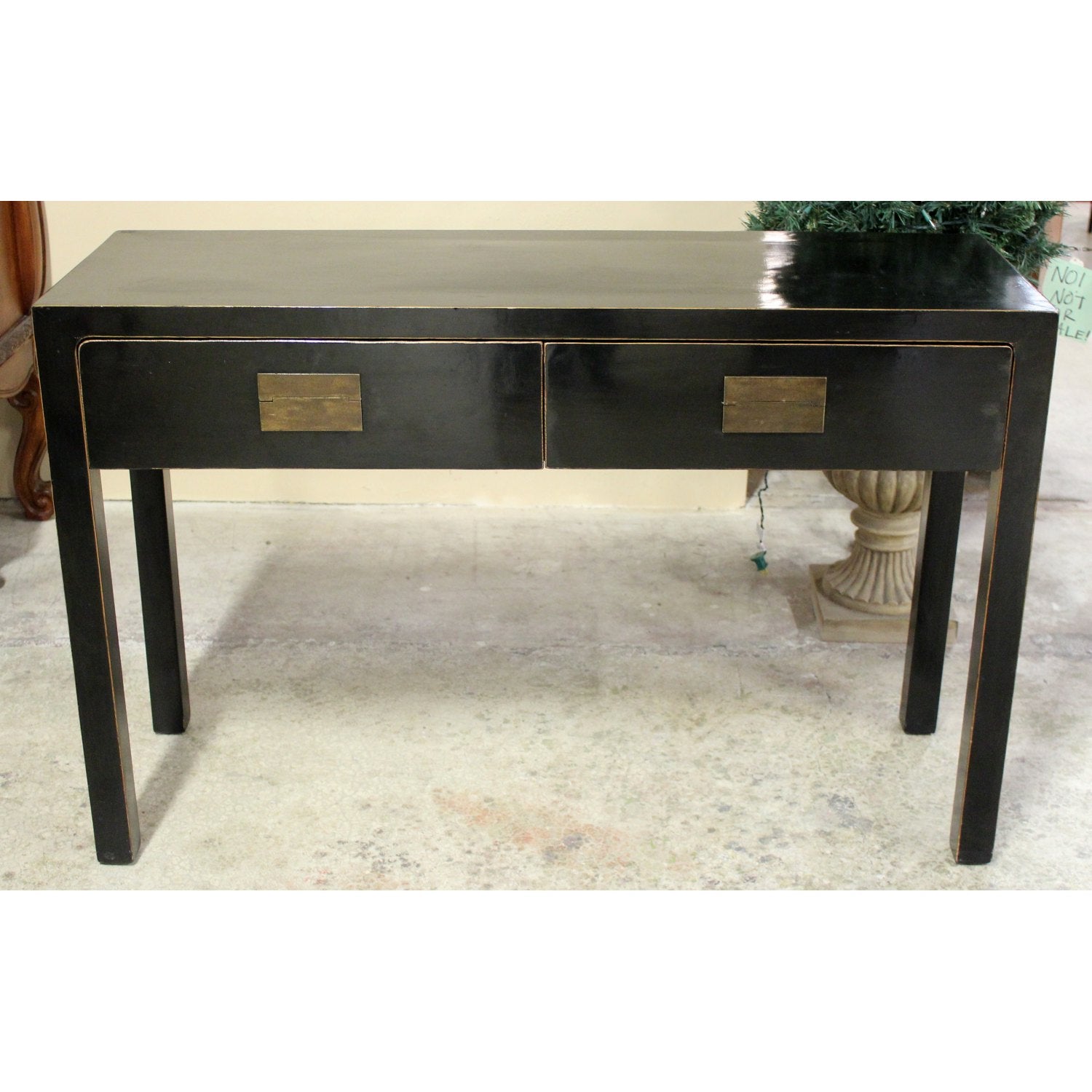 This piece features a black lacquer finish with clean, linear proportions and a contemporary silhouette. The two drawers are set with hinged rectangular brass pulls, adding a subtle contrast to the dark surface. Straight legs and a streamlined profile give it an understated look that aligns with Asian‑influenced design elements.