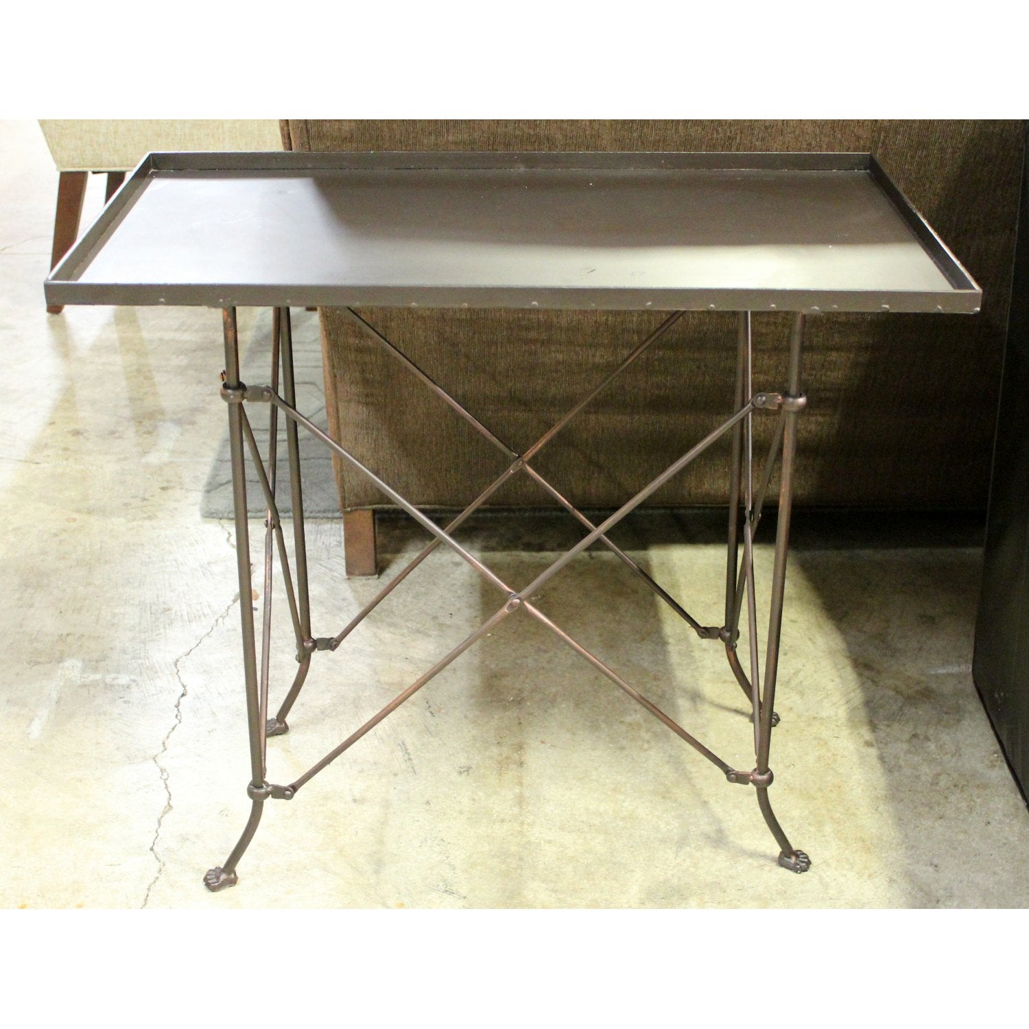 Campaign-style accent table in bronze-finished metal with a rectangular tray top and raised edges. The base features slender rods in a geometric cross-braced configuration, supporting curved legs that terminate in stylized paw feet. Industrial lines and compact proportions suit modern or transitional interiors.