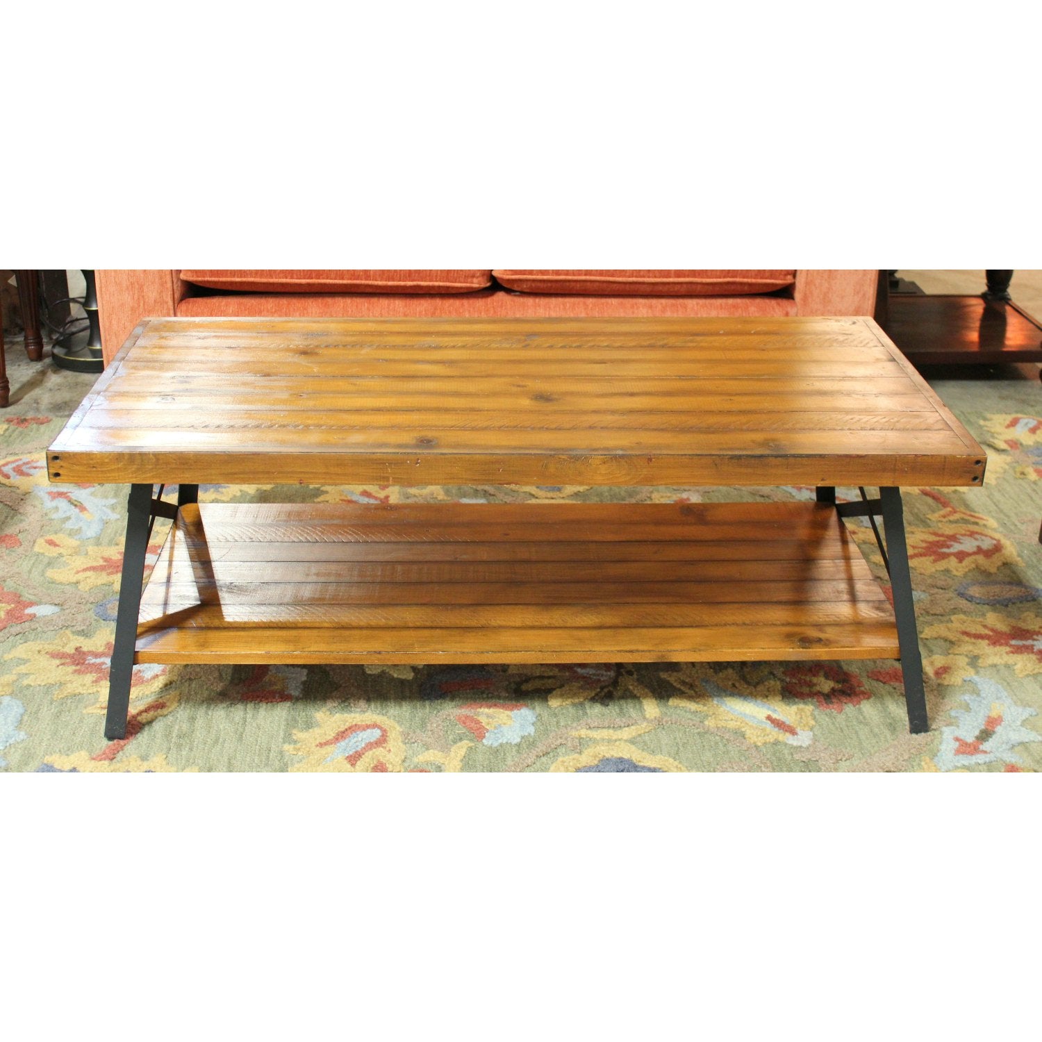 Rectangular coffee table with a plank-style wood top and matching lower shelf for storage or display. Black metal frame with diagonal side supports adds an industrial contrast to the rustic wood grain.