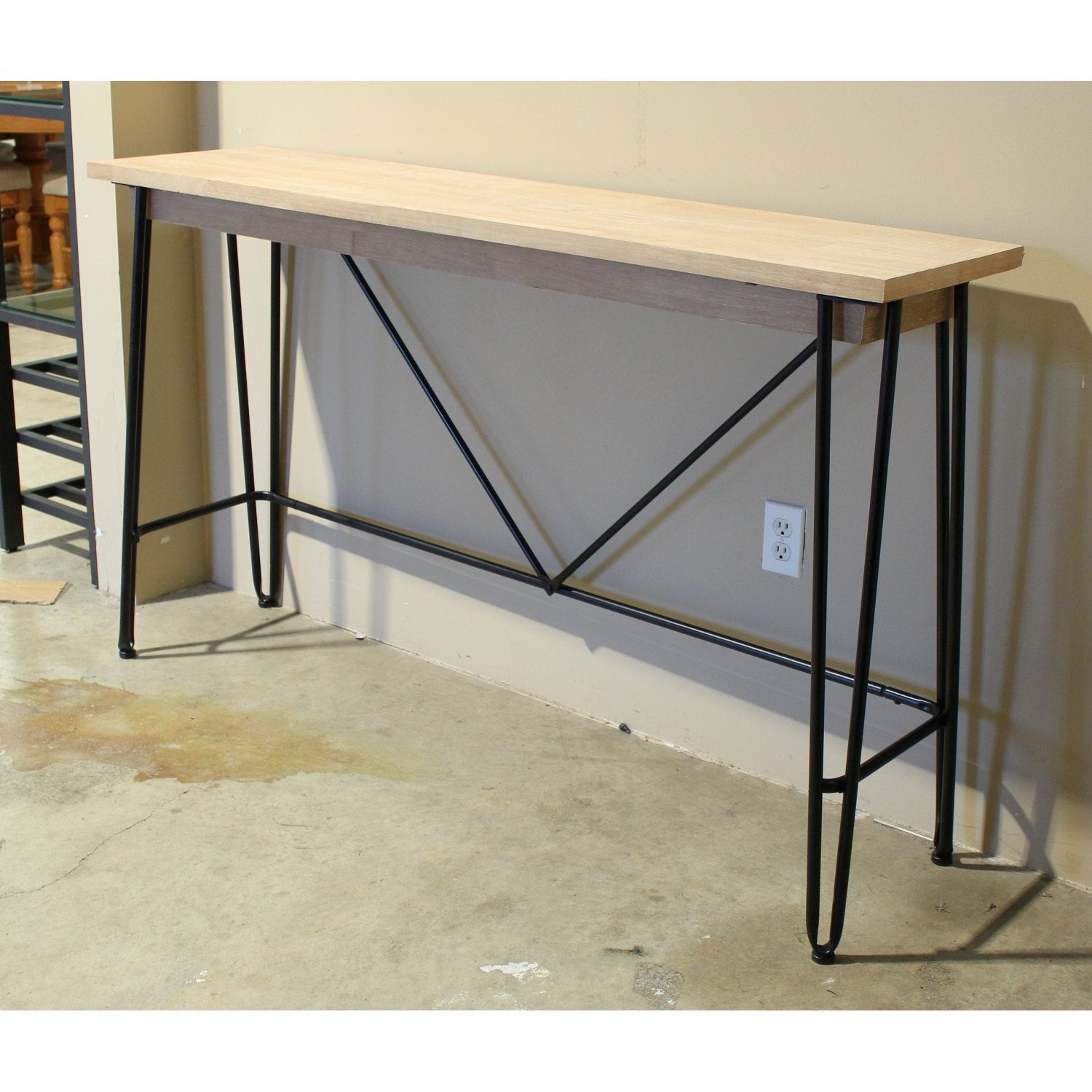 Minimalist and industrial in style, this long console table features a raw, un-sanded light wood top with visible grain variation. The black metal base incorporates hairpin-style legs and angular crossbars for added structural integrity and geometric appeal. Its extended length and open frame make it suitable for narrow spaces or layered display.