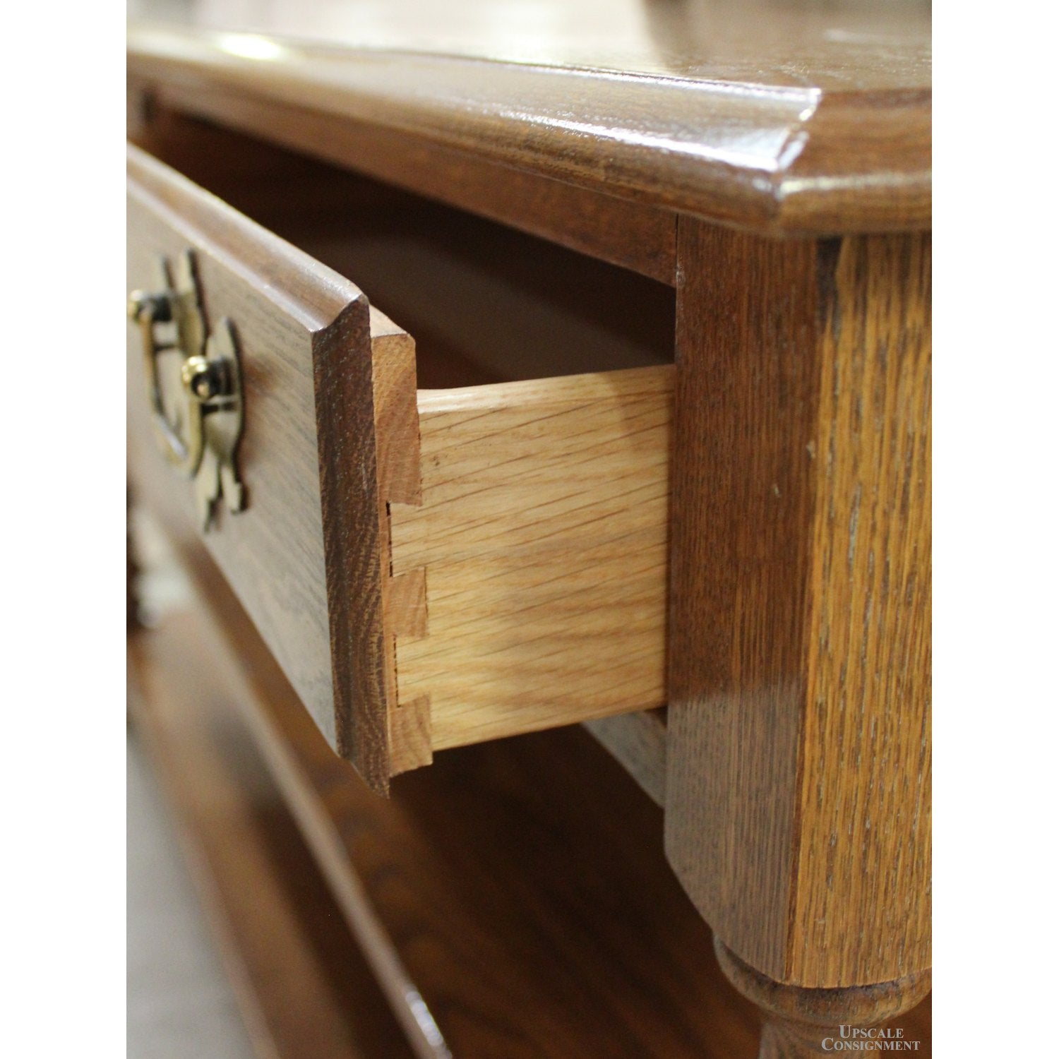 Oak console in a traditional style, featuring two dovetailed drawers on wooden slides with brass pulls. Turned legs support a warm oak frame and two lower shelves that offer open storage. The finish and proportions align with classic living room furnishings.