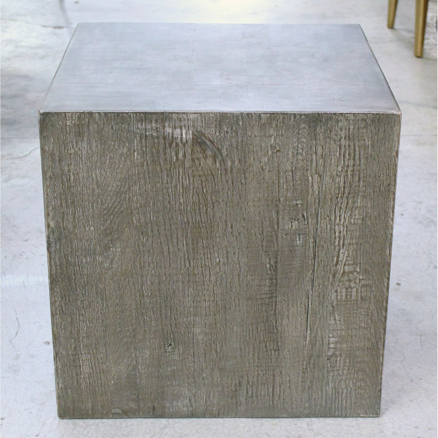 This piece features a clean Parsons-style silhouette with straight edges and a uniform block form. The surfaces show a reclaimed oak texture in a gray tone. Its solid, cube-like construction gives it a substantial presence suitable for use as a side table or pedestal. NOTE: These cubes are SOLID wood, and are VERY HEAVY!