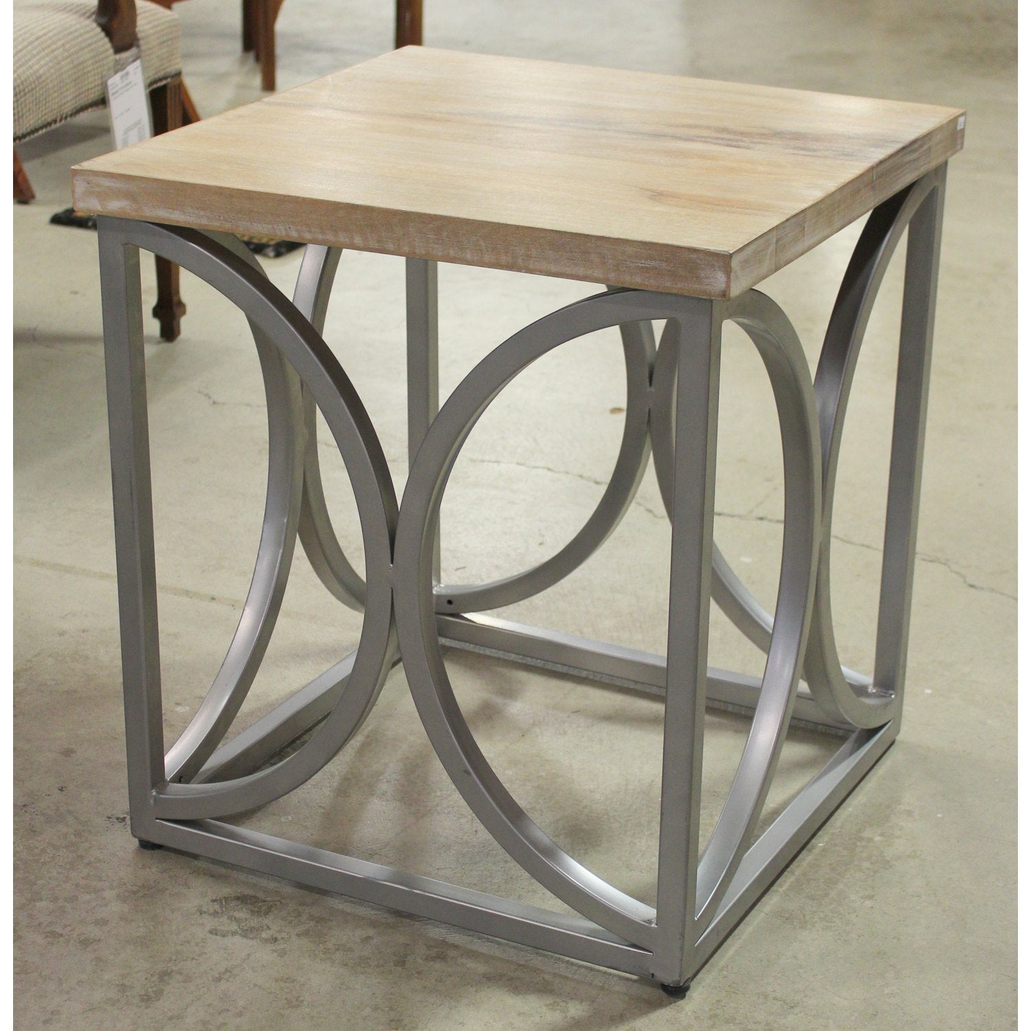 Square end table with a light wood top and welded steel base featuring a polished finish. The open-frame base is constructed from curved intersecting rods that form symmetrical loops and arches, lending a sculptural quality. The contrast between the natural wood and sleek metal suits modern or eclectic interiors.