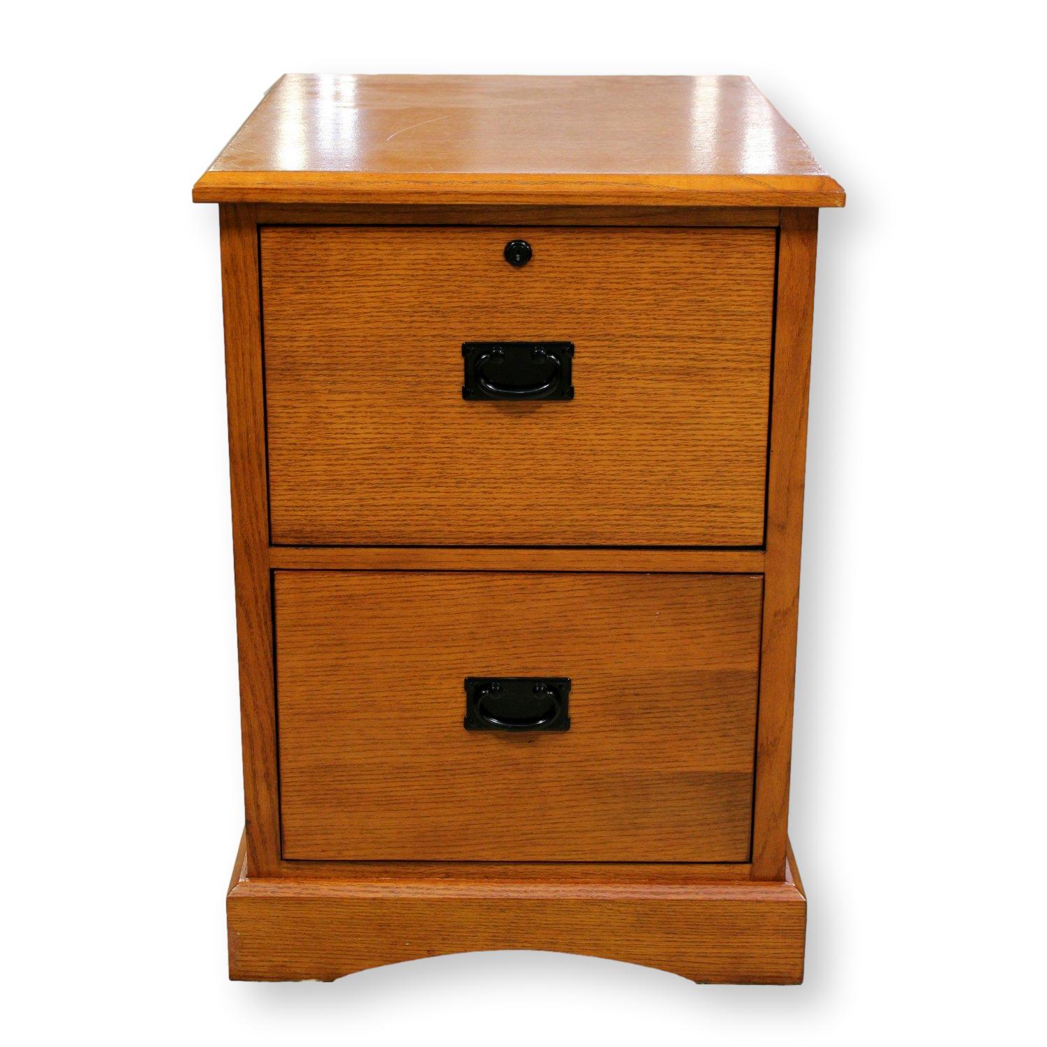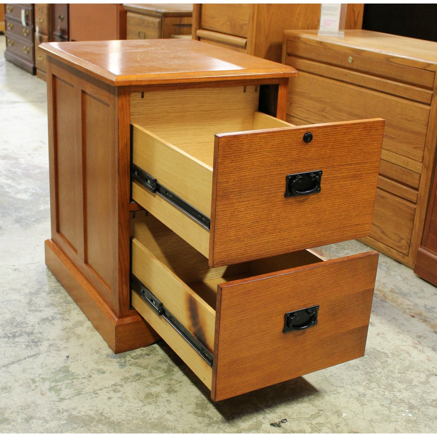 Mission-style two-drawer file cabinet in medium-toned wood with recessed side panels and a beveled top. Each drawer features full-extension glides and black metal pulls; the top drawer includes a key lock (key not available). Designed for document storage in home or office settings.