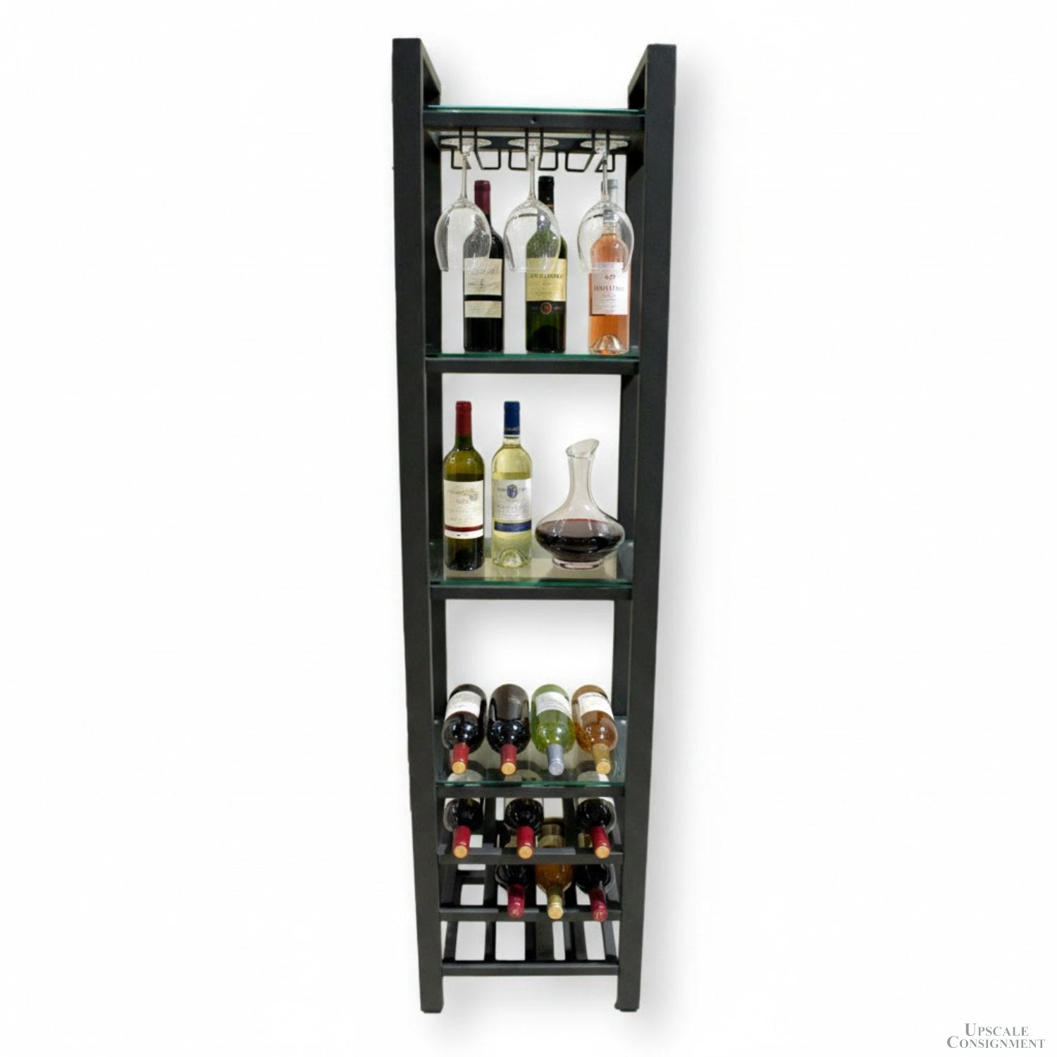 Modern and space-efficient, this tall shelving unit features a matte black metal frame with four clear tempered glass shelves for display or storage. The top section includes a built-in stemware rack, while the lower portion offers three horizontal bottle shelves designed to cradle standard wine bottles securely. Its vertical format suits narrow spaces and complements contemporary interiors.