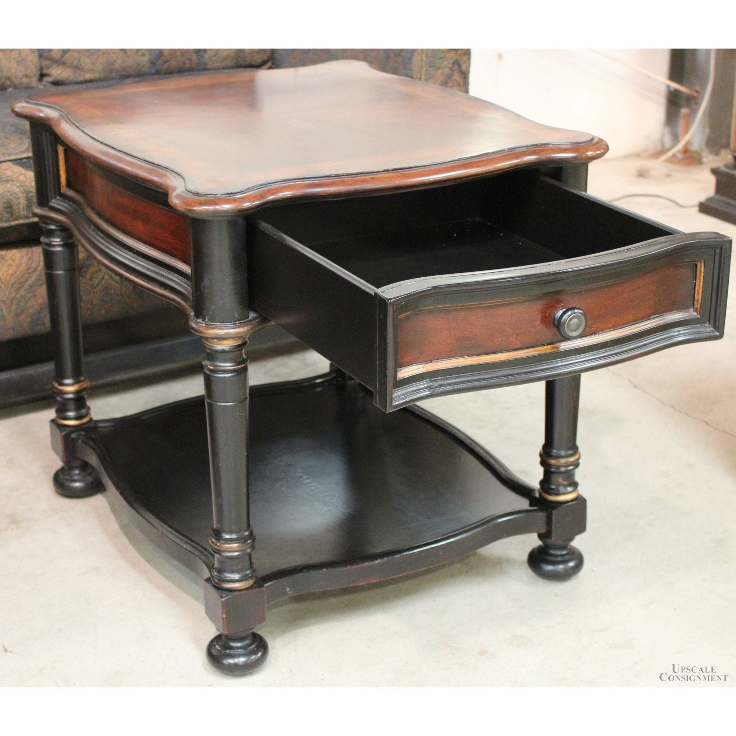 Features a two-tone finish in black and red mahogany, a patterned veneer top with scalloped edges, single drawer, an open shelf below, and turned legs.