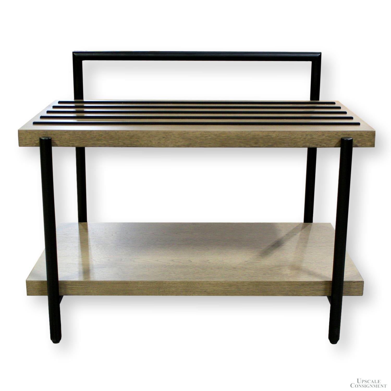 Two-tier nightstand with a black metal frame and warm wood surfaces. The top shelf features evenly spaced black metal rods integrated into the wood, offering visual structure and potential grip for lightweight items. Lower shelf provides open storage with a clean, uninterrupted wood surface. Design emphasizes contrast and utility in a compact footprint.