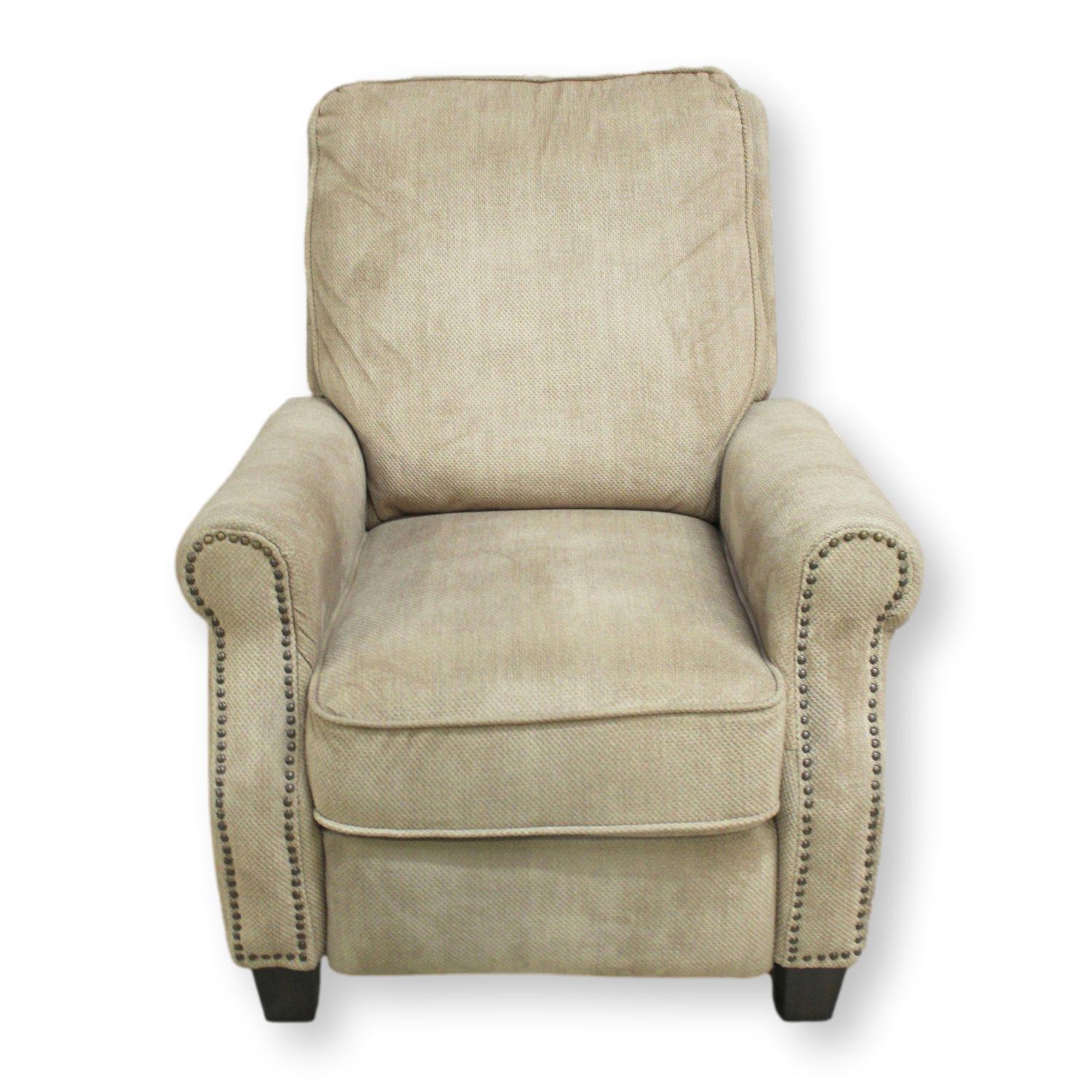 Upholstered in textured tan chenille, this push-back recliner features rolled arms with nailhead trim and a manually adjustable backrest and footrest. The chair rests on dark wooden legs. Its tailored silhouette and neutral fabric suit both traditional and transitional interiors.