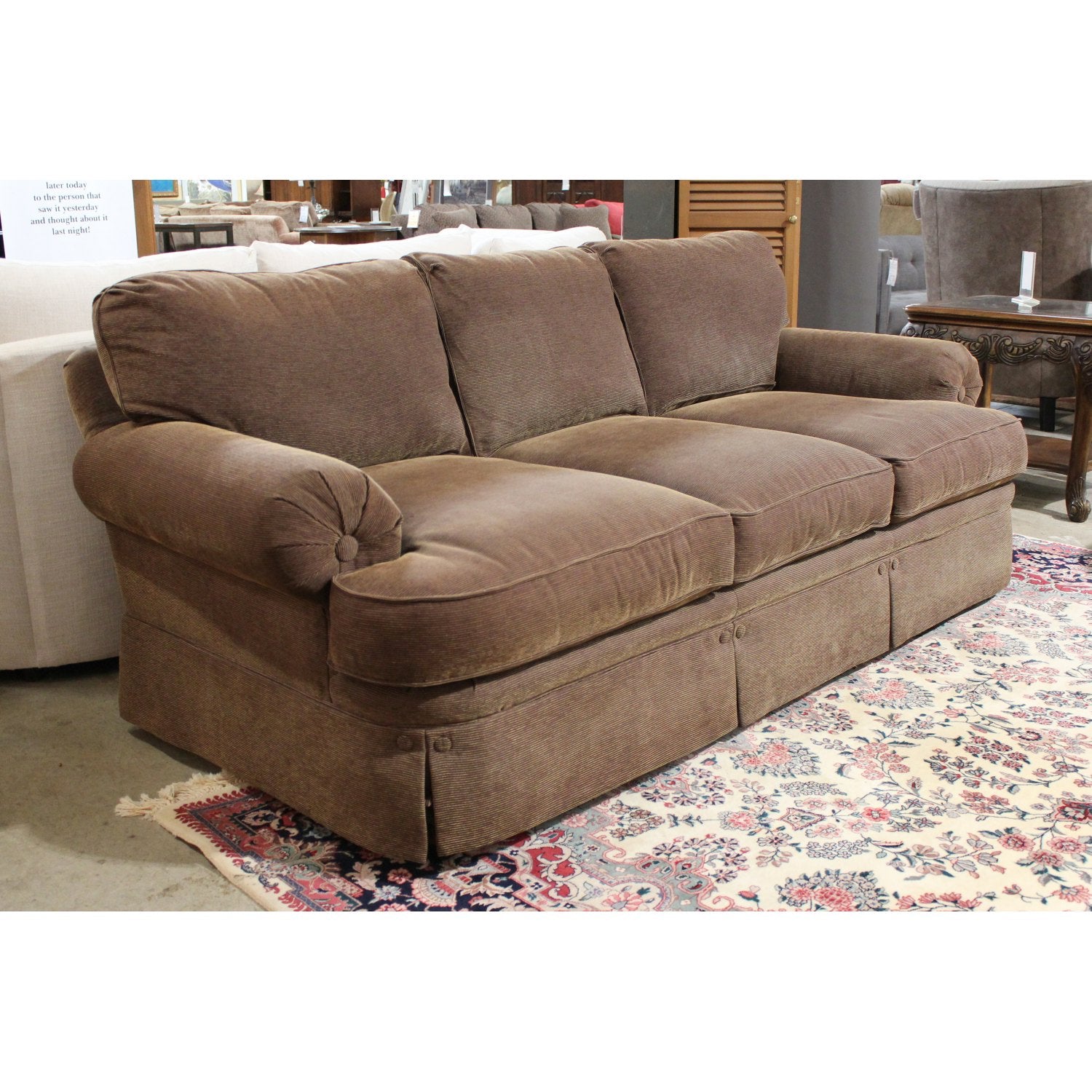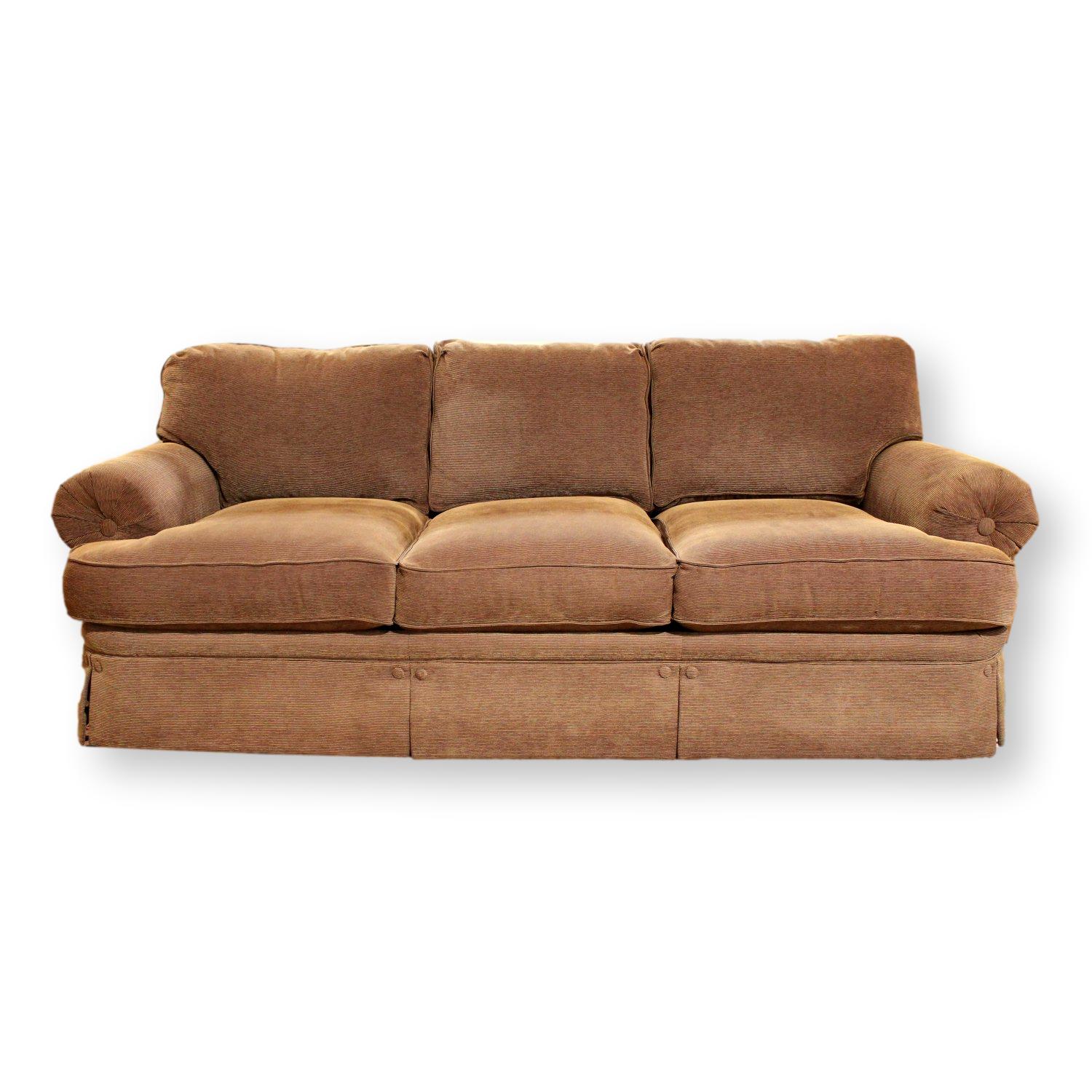 Upholstered in textured brown corduroy, this three-seat sofa features rolled arms, button tufted accents, and a tailored skirt that conceals the legs. The seat and back cushions are plush and removable, offering a relaxed, traditional silhouette. Suitable for living rooms or dens where comfort and understated design are preferred.