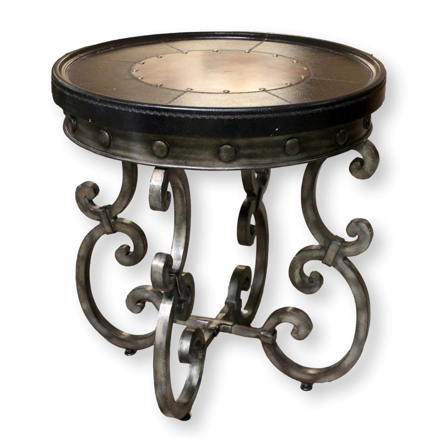 Industrial-style accent table with a round top featuring copper and leather inlay, bordered by nailhead trim. The base is constructed from wrought iron with ornate scrolling legs and a distressed finish. Substantial weight and solid construction make it suitable for use as a functional or decorative piece.
