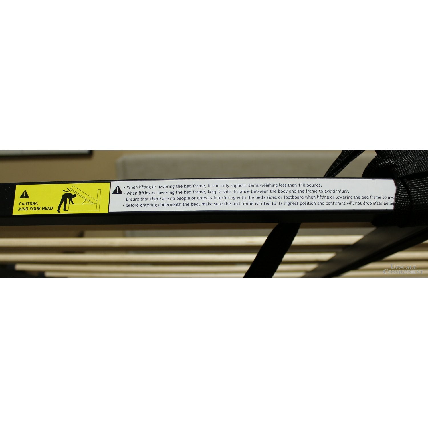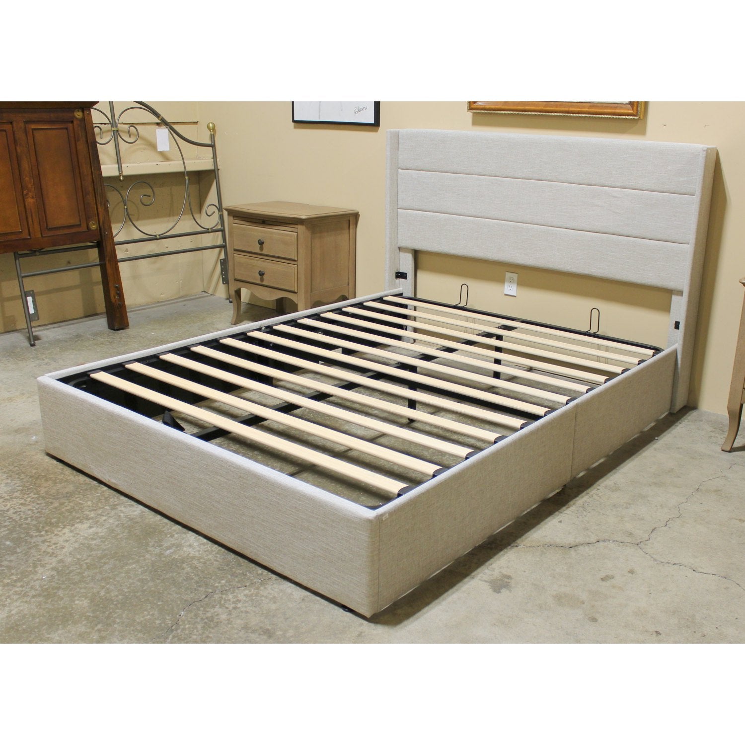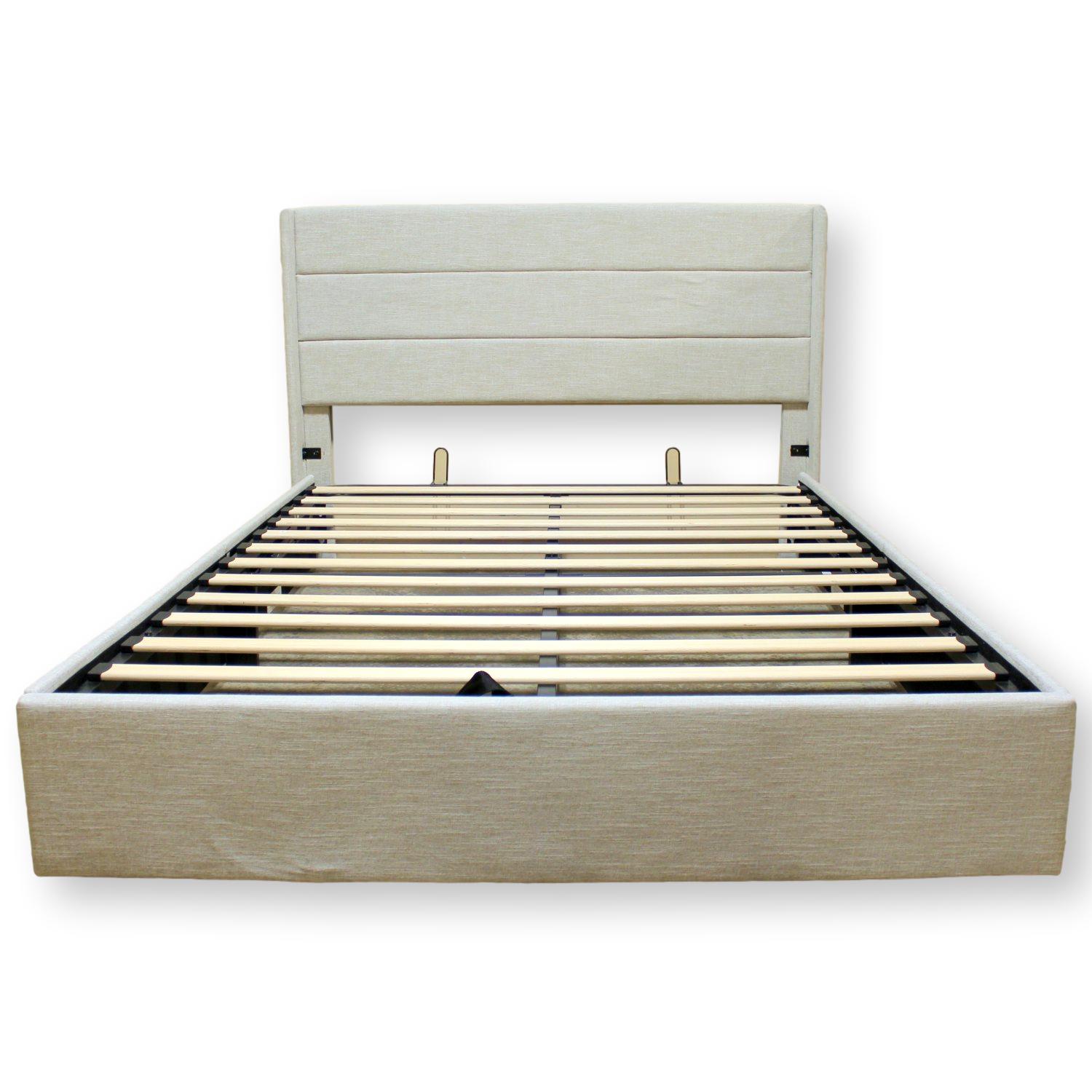 Beige upholstery and a horizontally stitched headboard lend a clean, tailored look to this low-profile platform bed. The lift-up frame reveals hidden under-bed storage, supported by wooden slats that eliminate the need for a box spring. Its neutral palette and streamlined silhouette suit contemporary interiors.