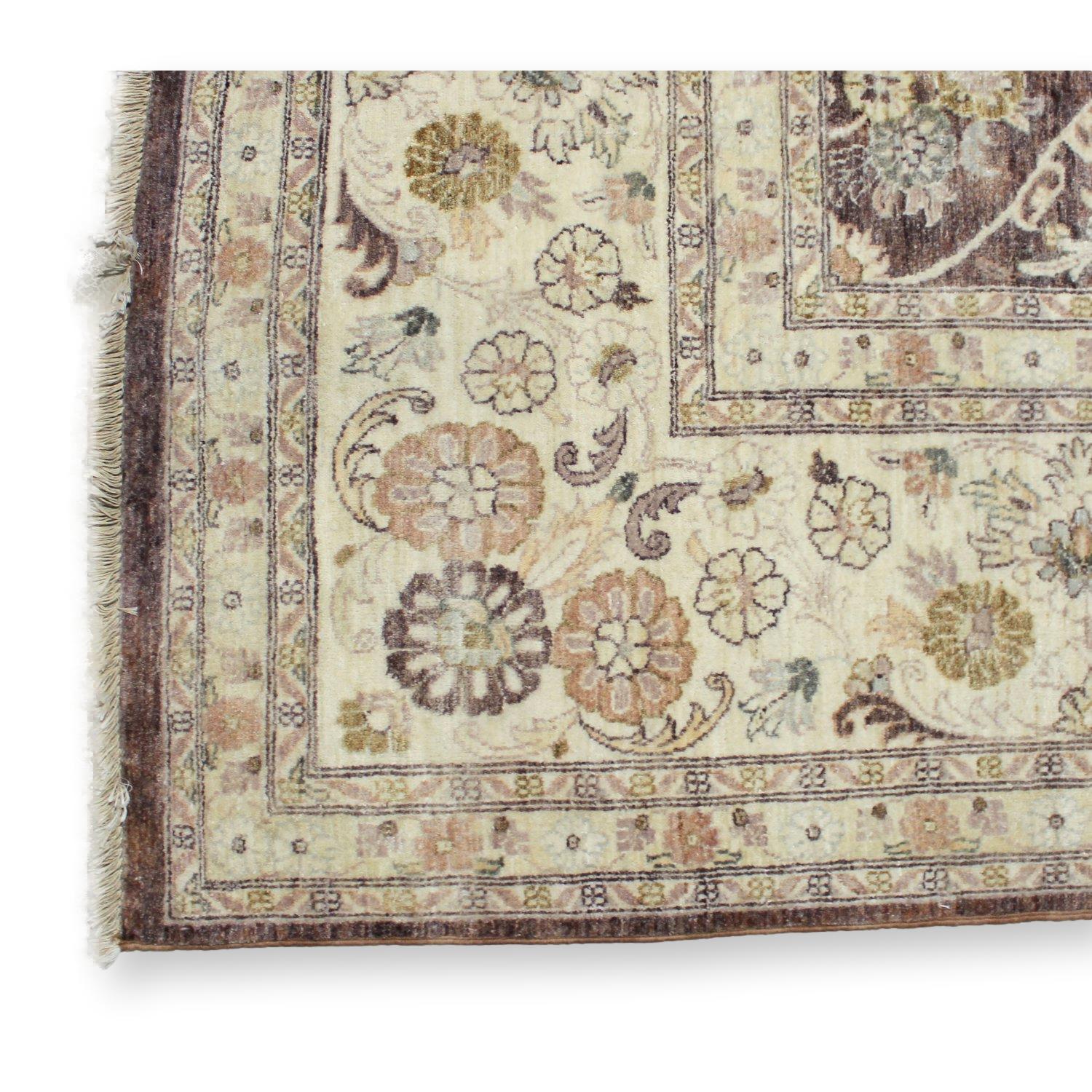 This hand-tied wool piece features a traditional floral panel layout in muted shades of brown, tan, and cream, as shown in the photo. The large-scale format highlights a central medallion and repeating botanical motifs framed by a detailed border. Its softened palette and symmetrical patterning give it a balanced, understated presence suitable for a wide range of interiors.