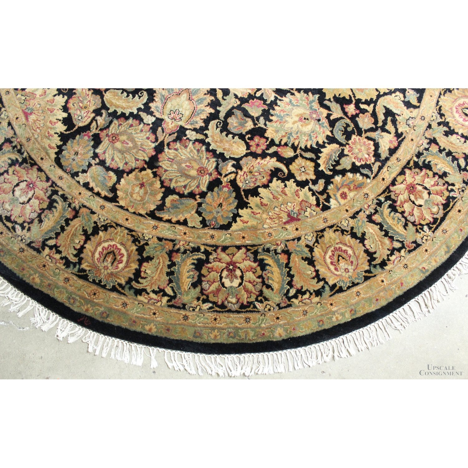 Traditional round wool rug featuring a black background with a symmetrical floral medallion and layered botanical borders in gold, pink, and green. The hand-knotted design is framed by a white fringe and measures approximately 8 feet 3 inches in diameter. Dense floral motifs and concentric banding suggest Persian or Indo-style craftsmanship.