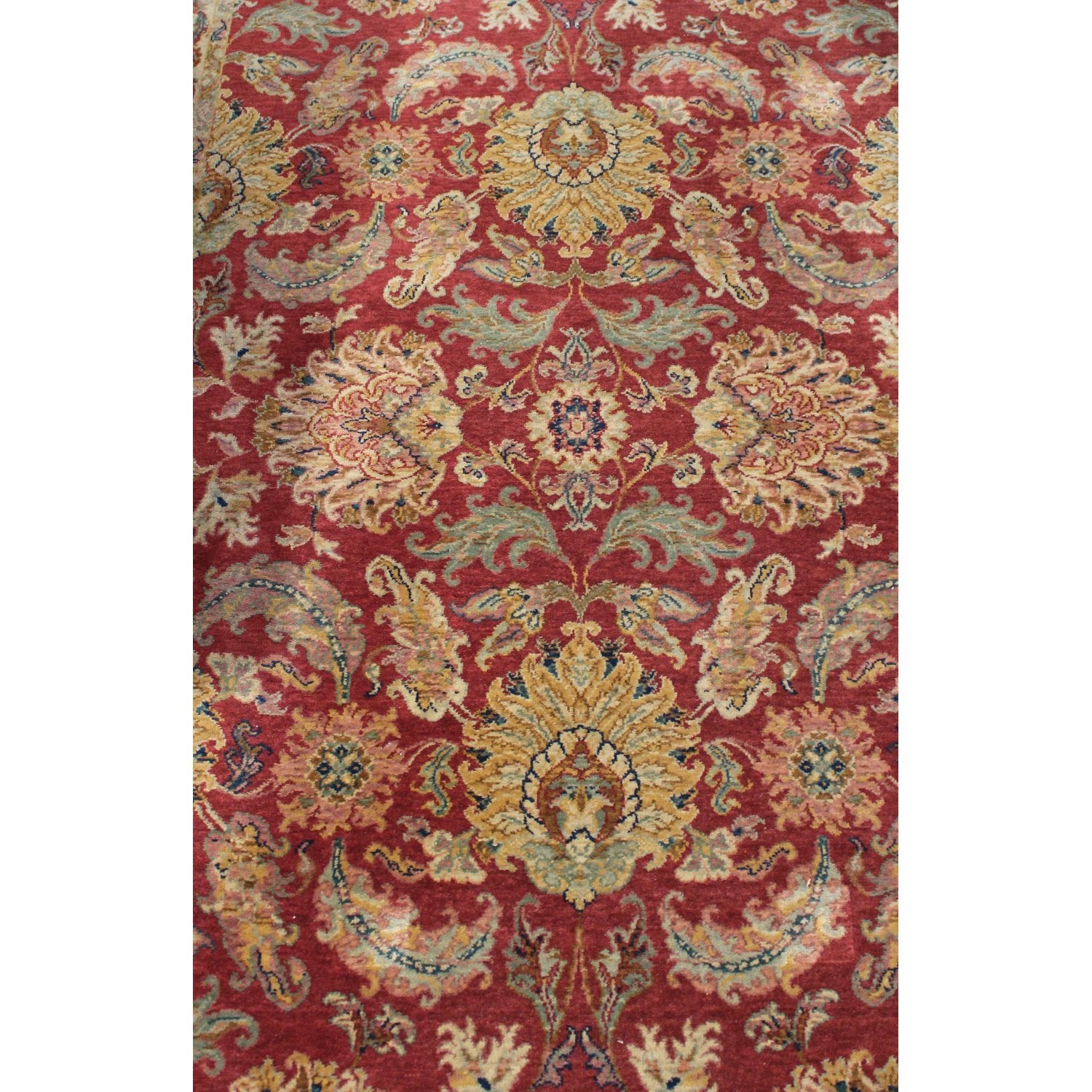 Features 100% New Zealand wool pile, a red and gold botanical pattern with green blue, pink, and tan accents, and cream fringe. Woven in Egypt.
