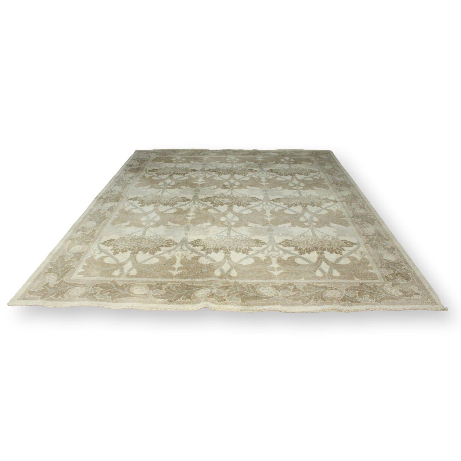 This approximately 8'2" x 10'1" rug features a symmetrical floral lattice pattern in soft beige, cream, and light brown tones. The central field is arranged in repeating botanical motifs, framed by a more detailed vine-and-leaf border. Its muted palette and traditional layout give it a refined, understated presence suitable for a range of interior styles.