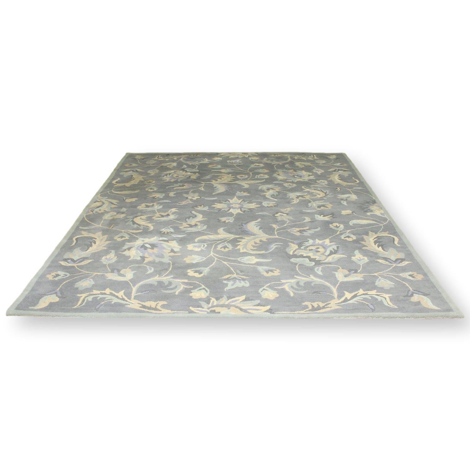 This large wool piece features a muted blue-gray ground with an allover botanical pattern in soft beige, cream, and pale blue. The scrolling vines and stylized florals are evenly distributed, giving the design a balanced, traditional layout. A subtle tonal border frames the field without interrupting the overall pattern.