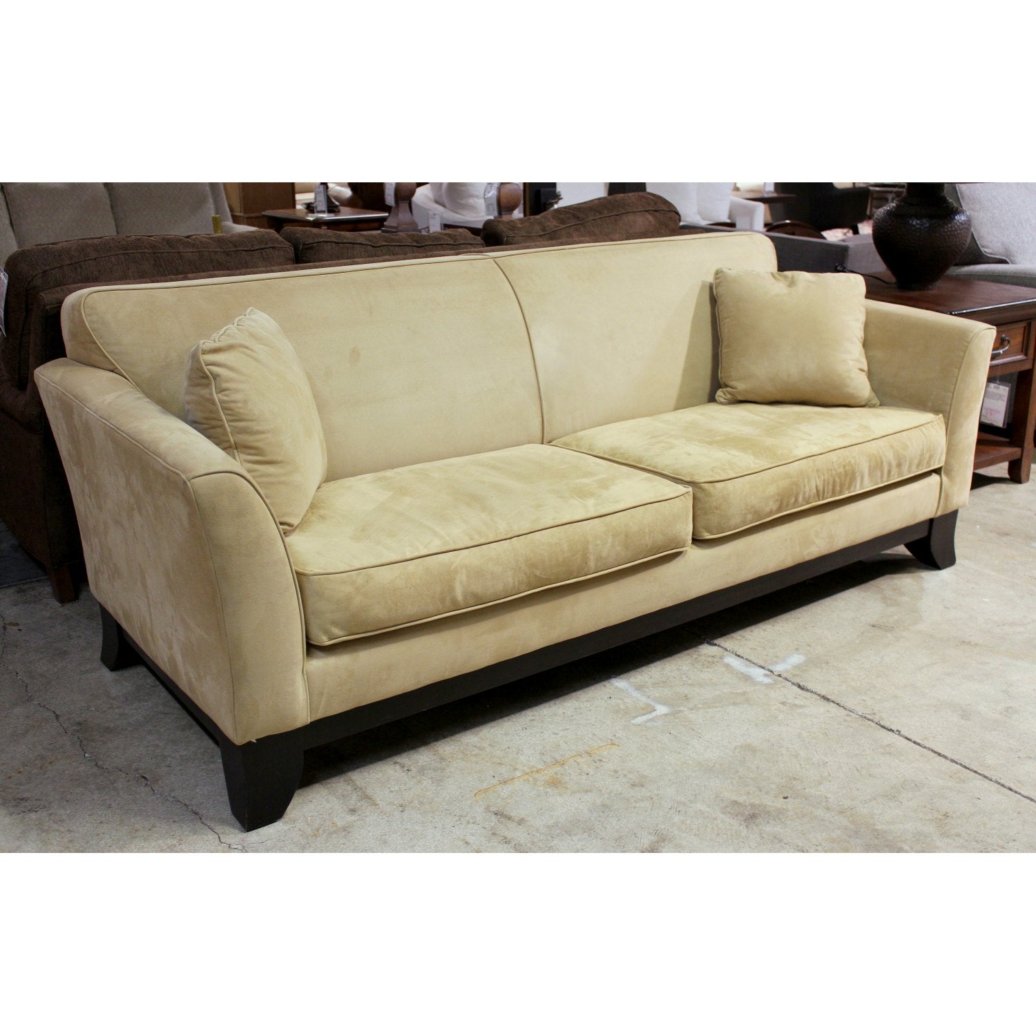 Contemporary two-seat sofa upholstered in beige microfiber with flared arms and dark wooden legs. Includes tight back cushion, two seat cushions, and a pair of matching throw pillows. Upholstery has a smooth, low-pile texture with subtle stitching detail. Frame and cushion proportions suggest medium-firm support suitable for everyday use.