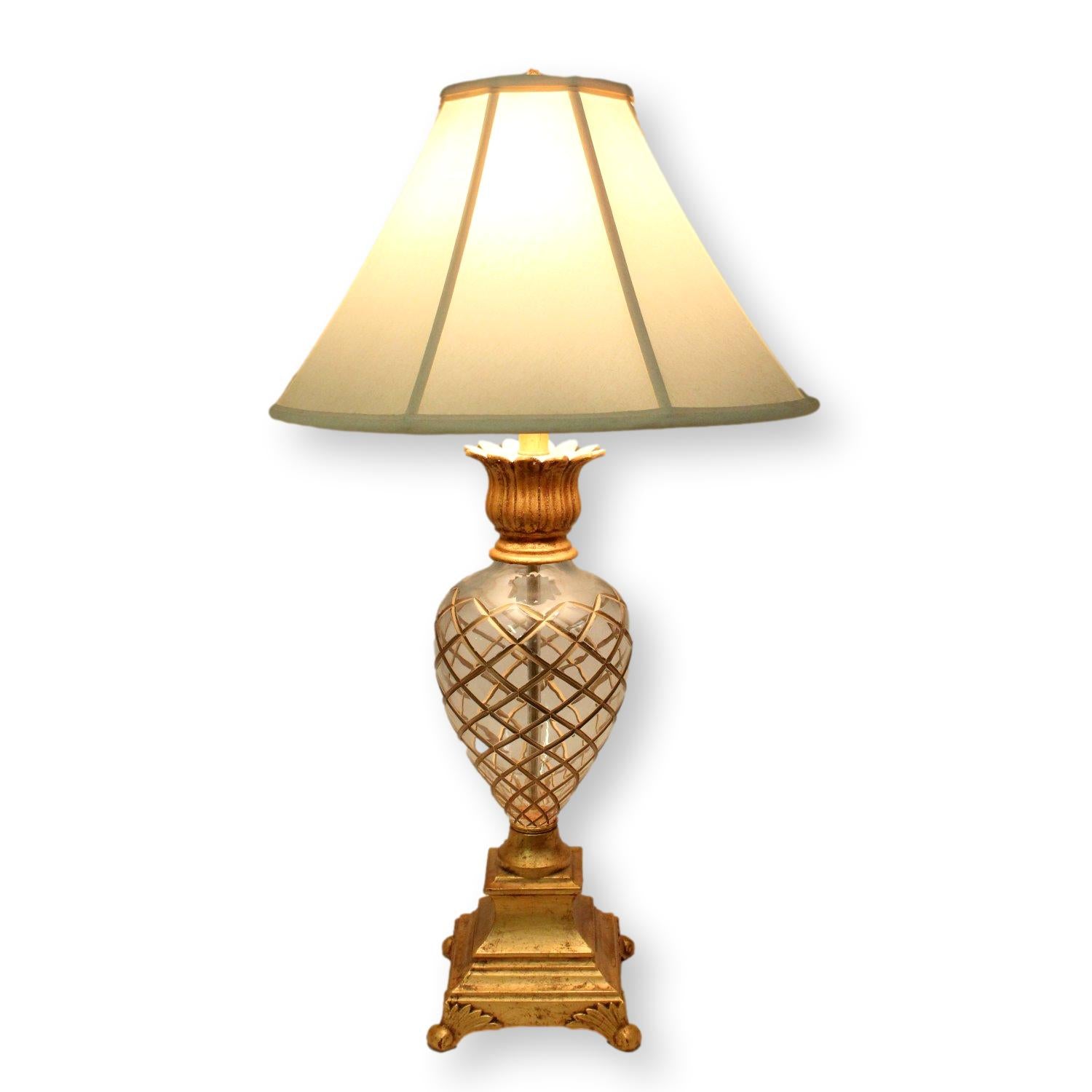 Ornate table lamp featuring a clear glass body encased in a gold-tone diamond lattice. The base is square with small feet and a stepped profile, finished in matching gold. A crown-like finial connects the body to a cream-colored conical shade. Classical and tropical design elements combine for a distinctive silhouette.
