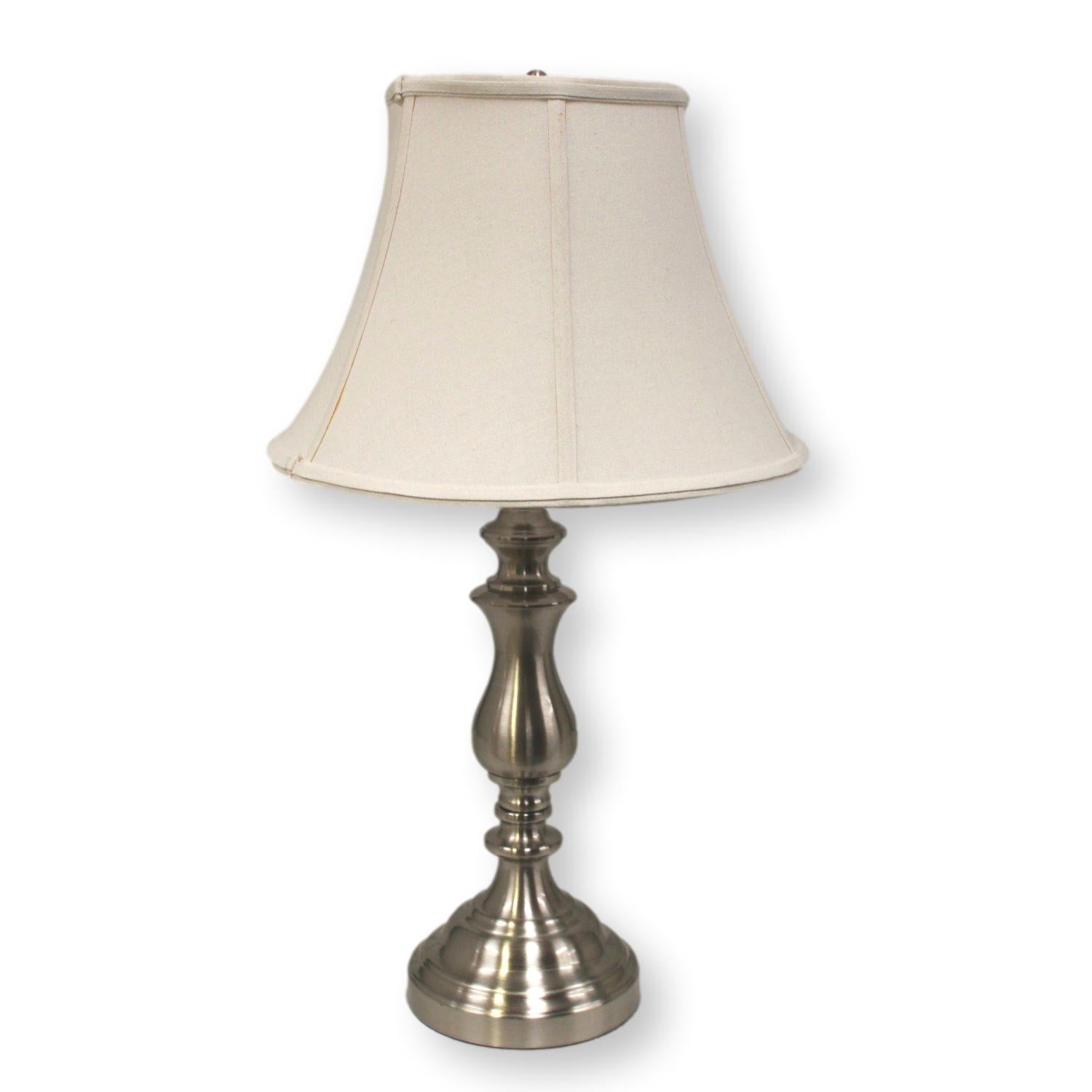Traditional-style table lamp featuring a brushed nickel finish and a turned base with subtle decorative detailing. The flared fabric shade offers soft diffusion and complements the clean lines of the metalwork. Suitable for use on bedside tables, desks, or accent furniture. Designed for standard bulb fittings.