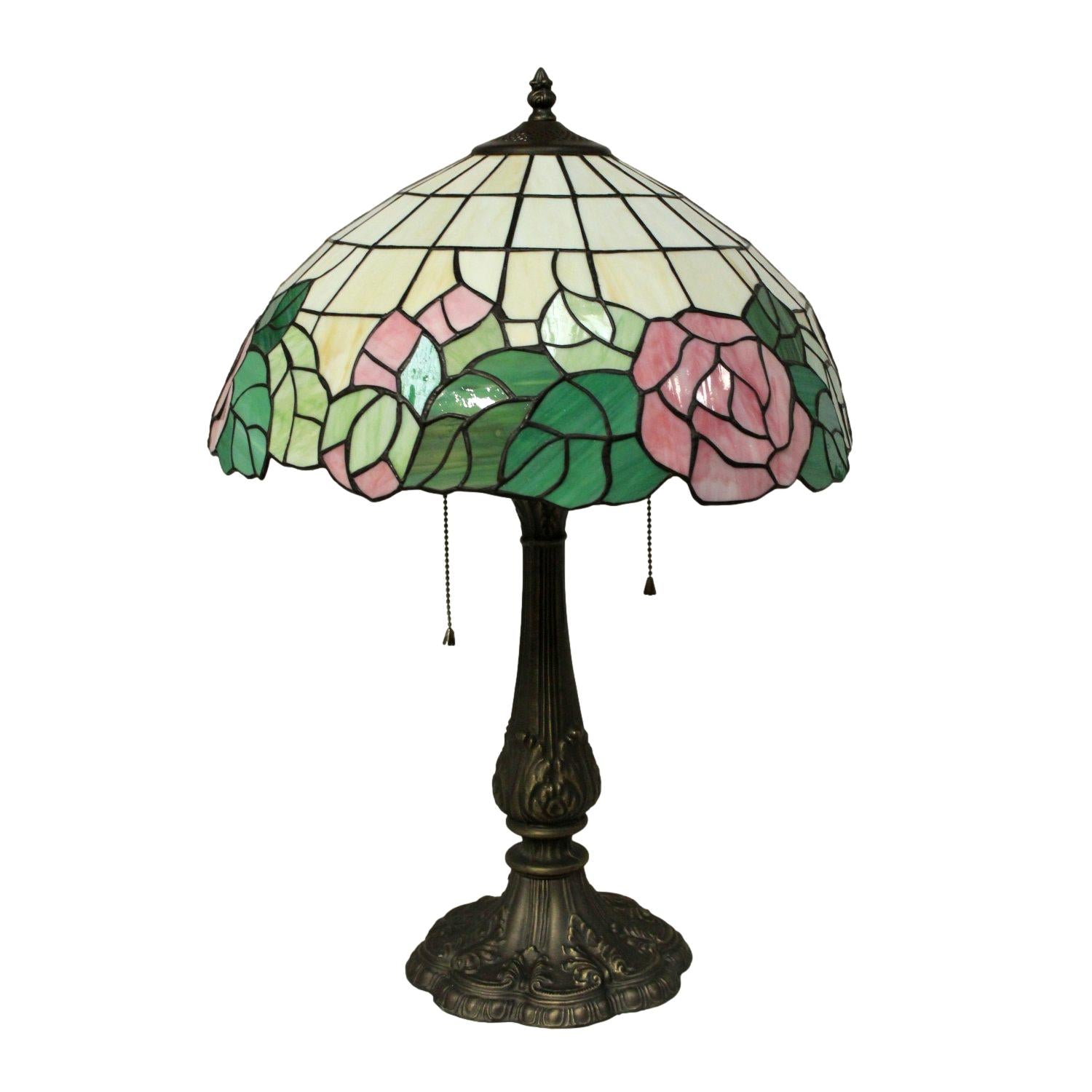 Tiffany-style stained glass shade features a dome silhouette with pink roses and green leaf motifs in leaded glass. The ornate metal base is cast with scrollwork and fluted detailing, finished in a dark bronze tone. Dual pull chains offer independent light control. Suitable for traditional or Art Nouveau-inspired interiors.