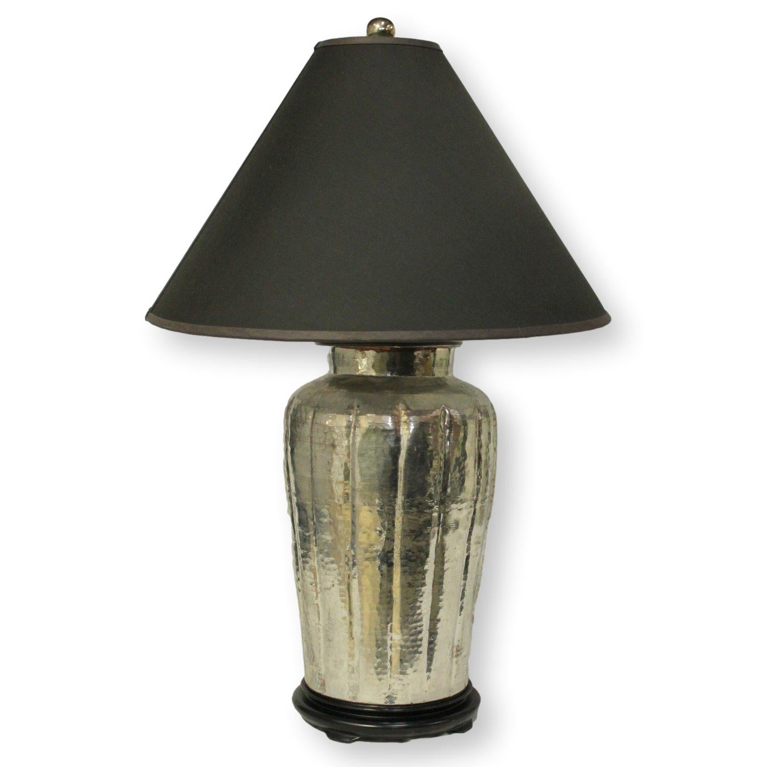 The lamp features a cylindrical metal base with a ridged, canister-style form and a reflective silver finish. Its charcoal fabric shade is tapered and sits over a compact round pedestal, creating a clean contrast with the textured body. The combination of vertical ribbing and a dark, simple shade gives it a straightforward, modern look suitable for a range of interiors.