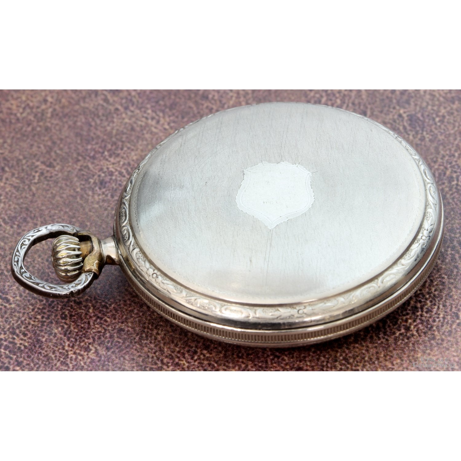 The serial number on the watch movement #27132689 indicates the following production information: production year was 1925, size is 12s, 7 jewels, grade 303, model 3, class 114, run quantity 20000, production dates: 1903 to 1939, open face configuration, pendant wind and set movement setting, and nickel damaskeening movement finish ("damaskeening" is the application of a decorative pattern on a watch movement).