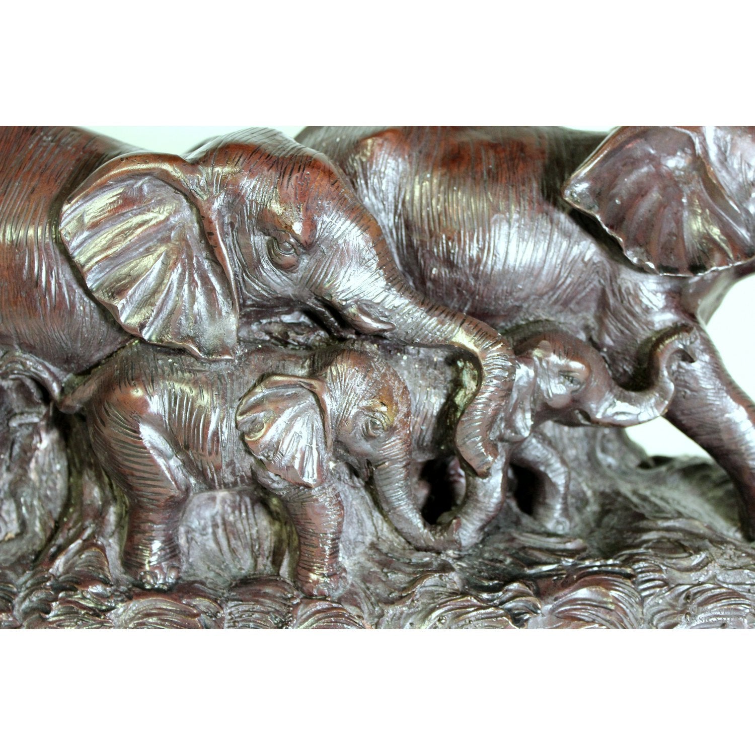 Detailed cast resin sculpture depicting a procession of adult and juvenile elephants, each rendered with textured skin and naturalistic movement. The figures are mounted on a wood-finish platform base that complements the warm tones of the carving. The composition emphasizes familial grouping and directional flow.