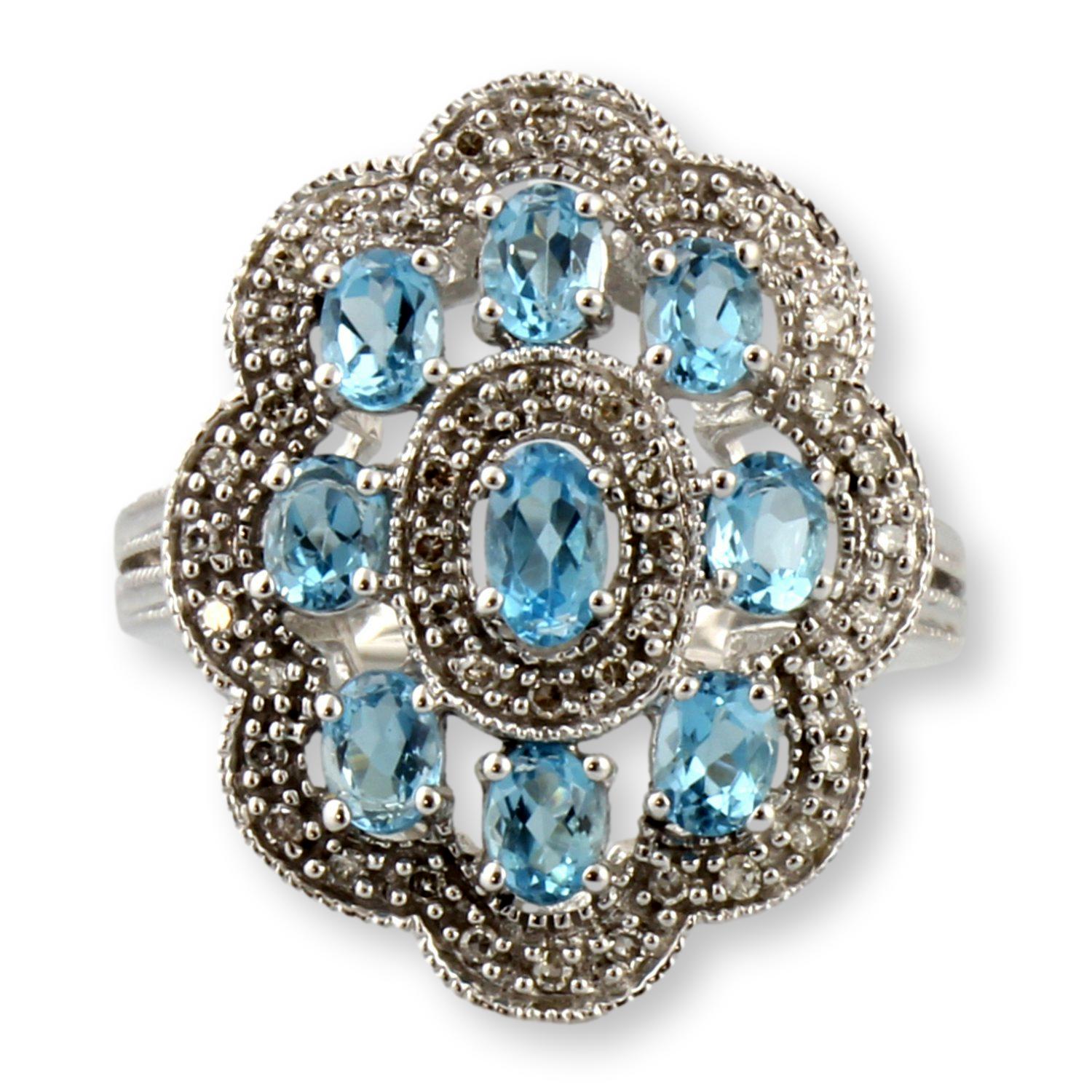 At its center rests an oval blue topaz (3 x 5 mm, approx. 0.22 carat), surrounded by eight oval blue topaz (3 x 4 mm each), creating a richly layered floral cluster. The vibrant sky-blue gemstones total approximately 1.36 carats and are framed by 44 round diamonds (1 mm each, approx. 0.16 carat total weight), adding brilliance and contrast.