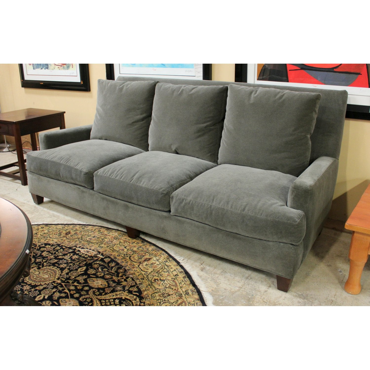 Three-seated sofa upholstered in a dense mohair fabric with muted gray tone; features straight padded armrests, three reversible seat and back cushions, and short dark wood legs for a low-profile silhouette. Suitable for modern interiors requiring durable, textured upholstery and clean lines.