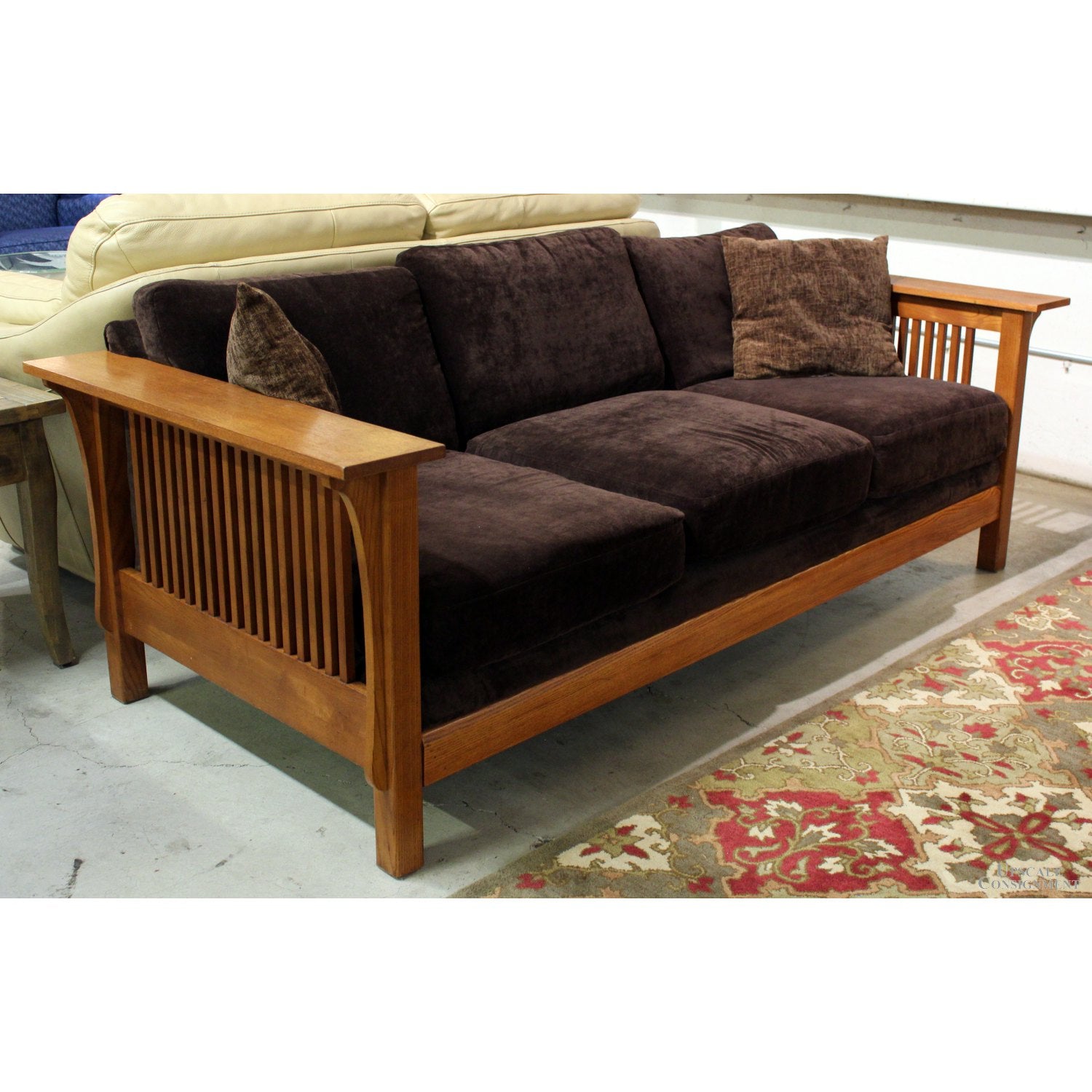 Mission-style three-seat sofa with an oak frame and slatted sides. Upholstered in dark brown velvety chenille, with three thick seat cushions and three matching back cushions. Wide, flat armrests and a natural wood finish emphasize the clean lines and craftsman construction.