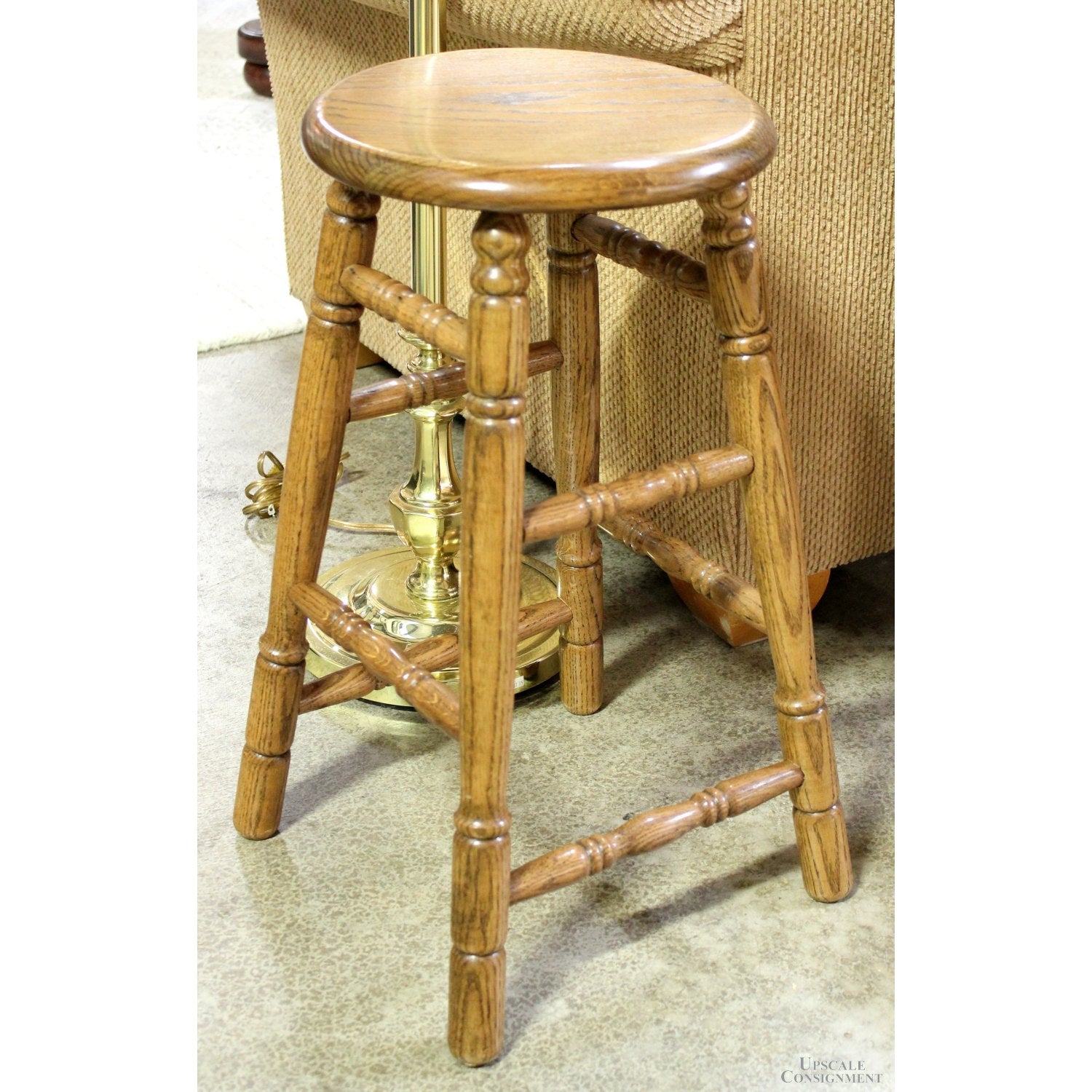 Oak stool with a round top and four turned legs featuring decorative grooves. The legs are joined by horizontal stretchers for added stability and visual balance. Natural wood finish highlights the grain and craftsmanship. Suitable for use as a seat or plant stand.