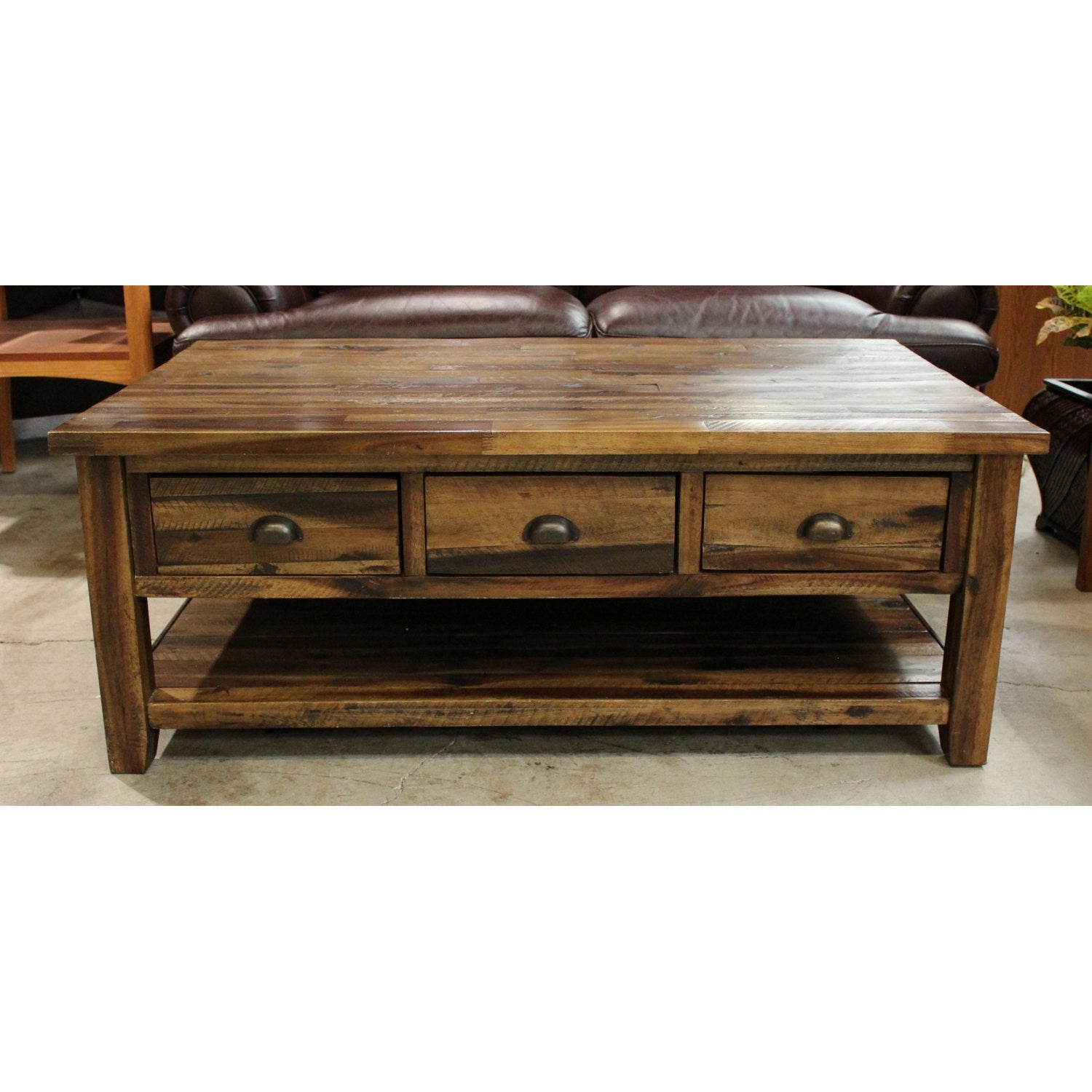 Features a factory rustic/distressed finish, a rectangular table top, 3 pass-through drawers can be accessed from either side, bronze finish drawer pulls, & an open shelf below.