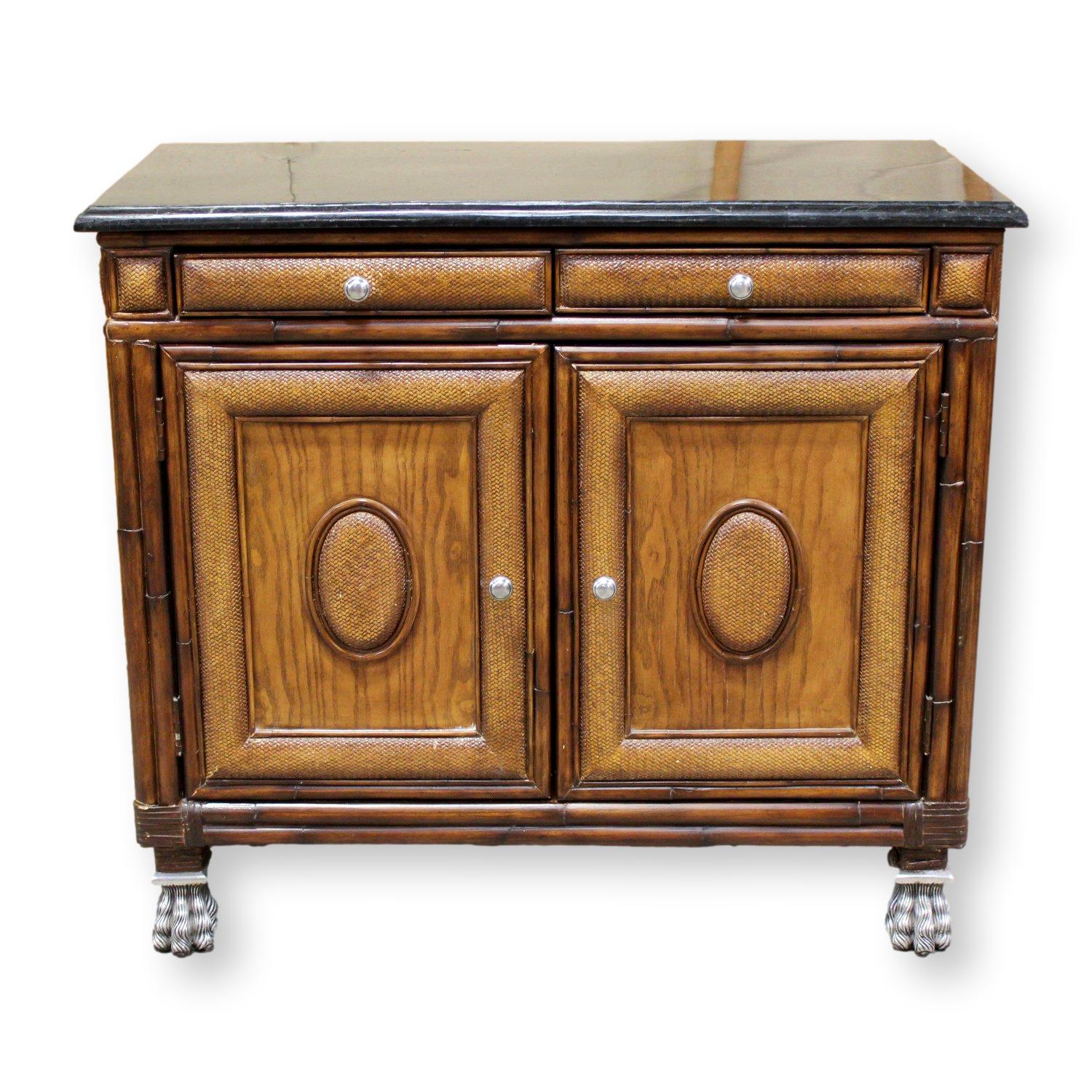 Crafted in a colonial-inspired style, this nightstand features a dark granite top, two upper drawers with textured fronts, and dual cabinet doors with oval center panels. Bamboo-style framing and claw-shaped metal feet add structural and decorative contrast. The wood surface has a warm tone with woven texture detailing along the sides and drawer faces.